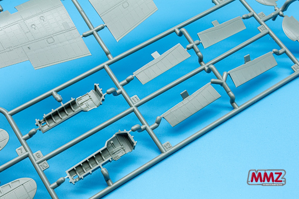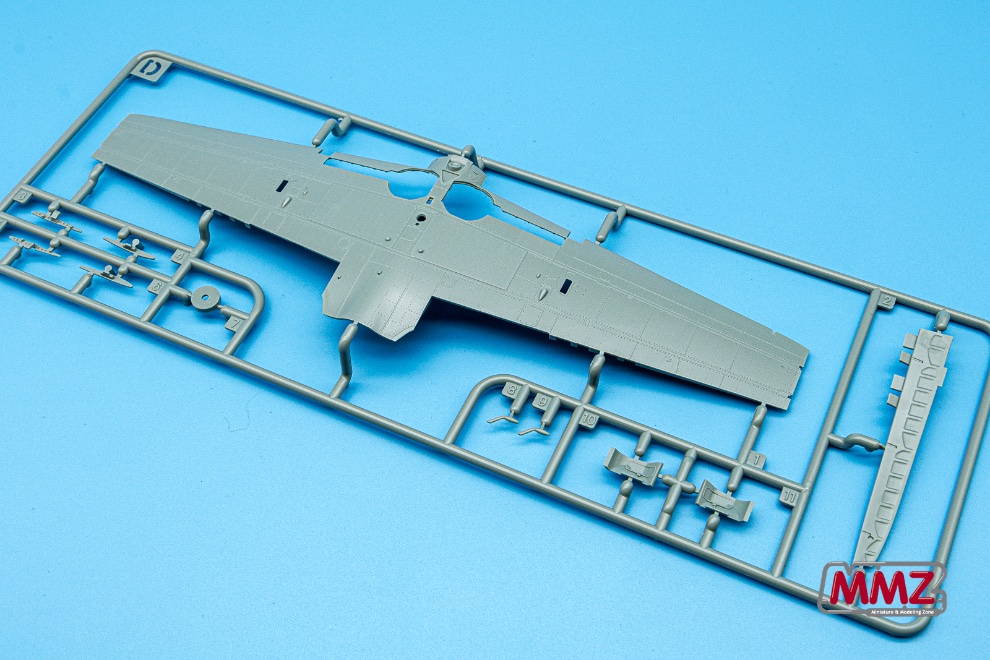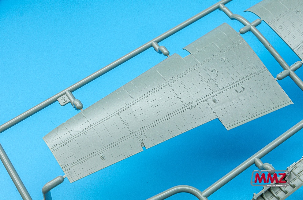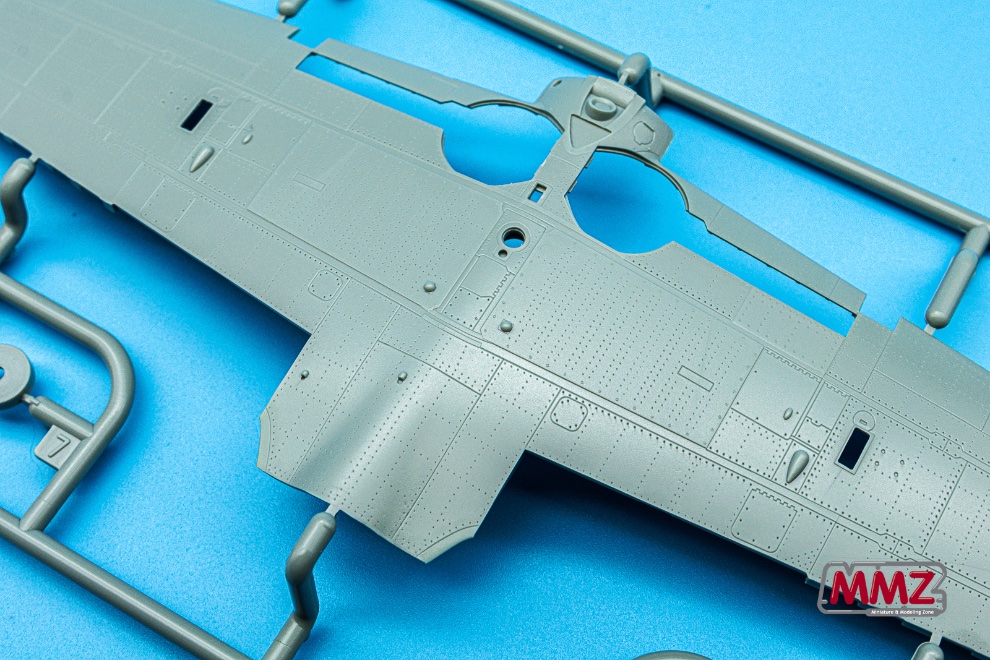 날개 상하면 부품 역시 샤프한 패널라인과 촘촘한 리벳들이 표면에 새겨져 있습니다. 그리고 주익 상하면에는 미세한 돋음 패널까지 정교하게 재현되어 있습니다.