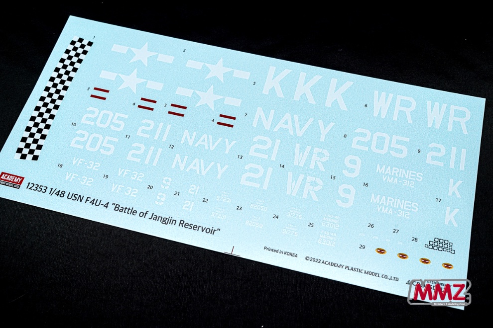 데칼은 한국전 장진호 전투에서 활약한 네개 비행대를 재현하고 있습니다. 요즘 아카데미 데칼은 더 언급할 필요가 없겠죠. 하지만 상당히 얇기 때문에 큰 면적을 붙일 때는 주의해야 합니다.