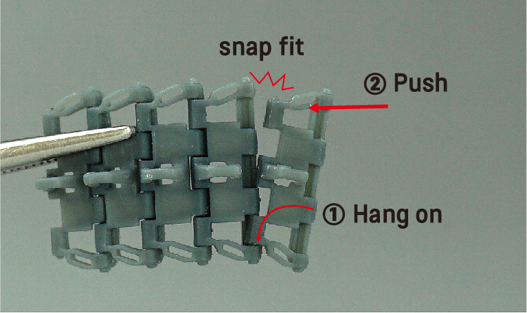 이 제품은 특이하게도 핀 방식이 아닌 스냅식으로 만들어져 있습니다. 재료의 탄성을 이용해 똑딱 똑딱 끼워버리는 방식입니다.