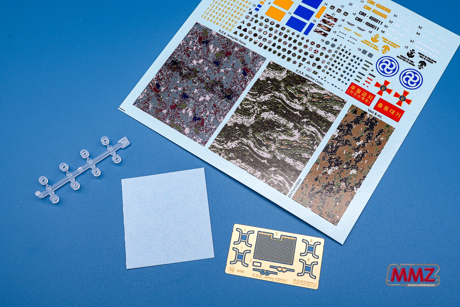 폴리캡, 애칭, 데칼 그리고 이제는 기본이 되어버린 마스킹 실이 포함됩니다. 데칼에는 한국국 군복 위장 무늬가 들어있습니다. 각 부대 마크도 다양하게 포함되어 이것만으로도 매우 유용할 것 같네요.