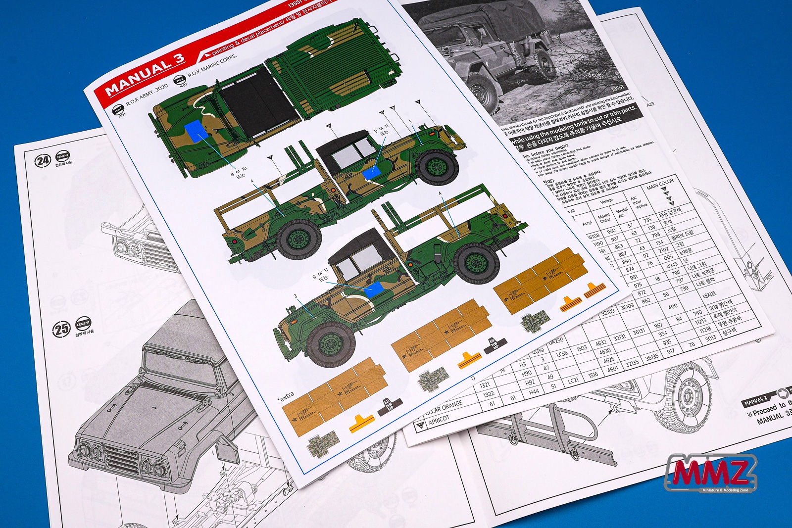 아카데미 스타일의 설명서와 다양한 도색예가 실려 있습니다. 한국군과 필리핀군의 다양한 마킹과 도색 패턴이 컬러로 수록되어 있습니다.