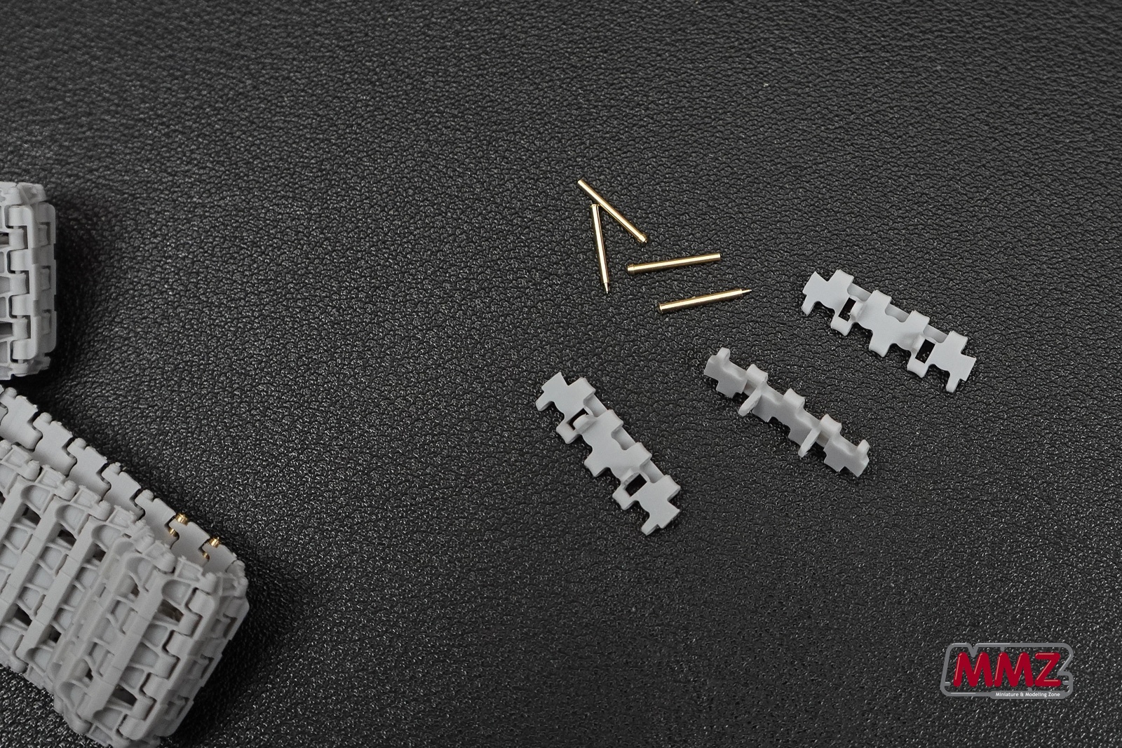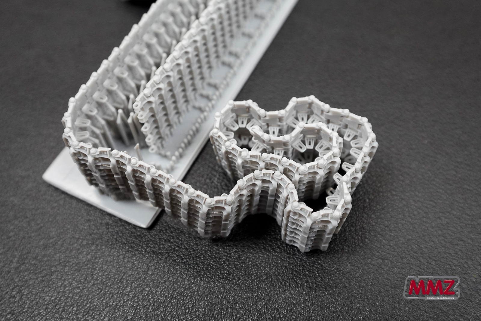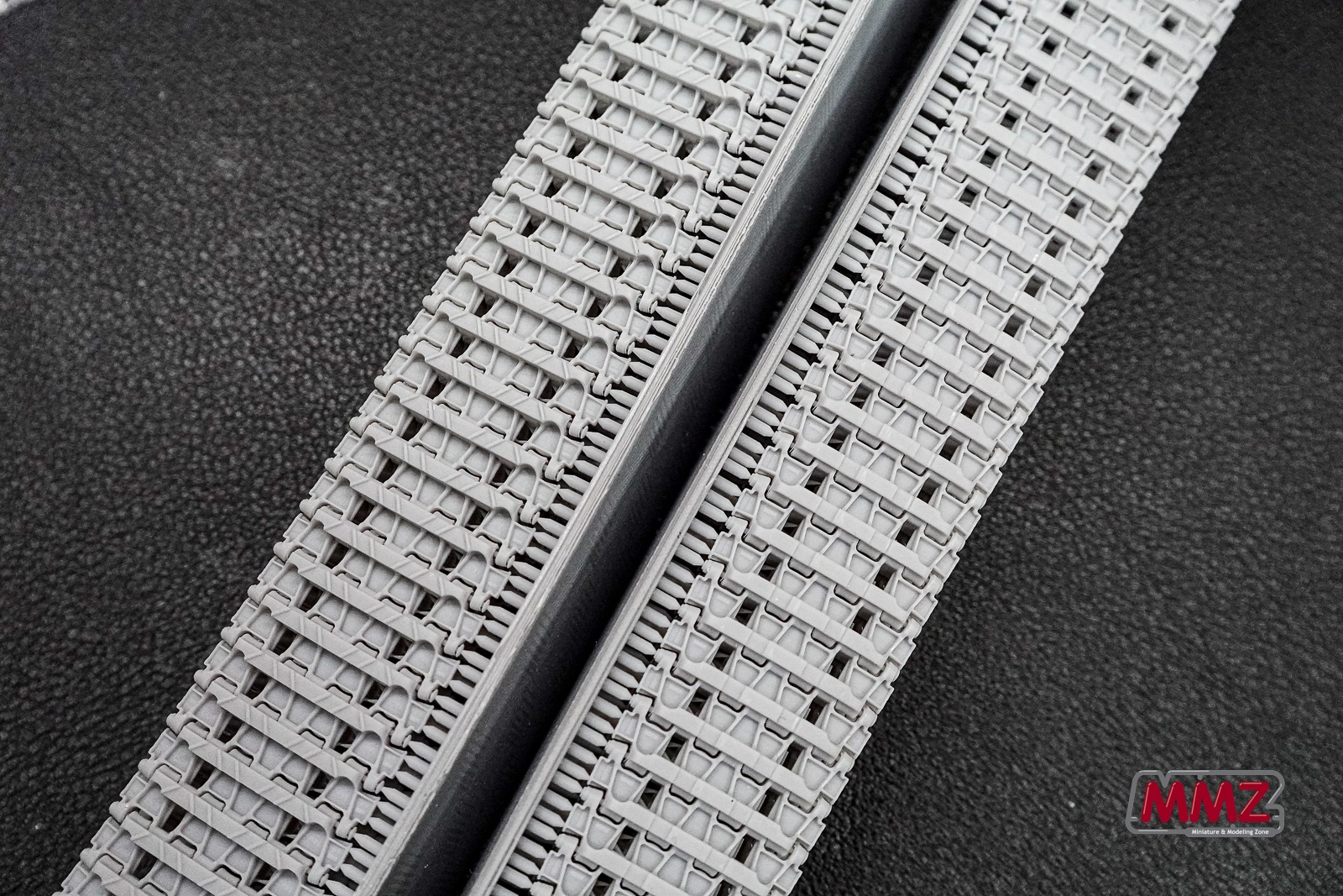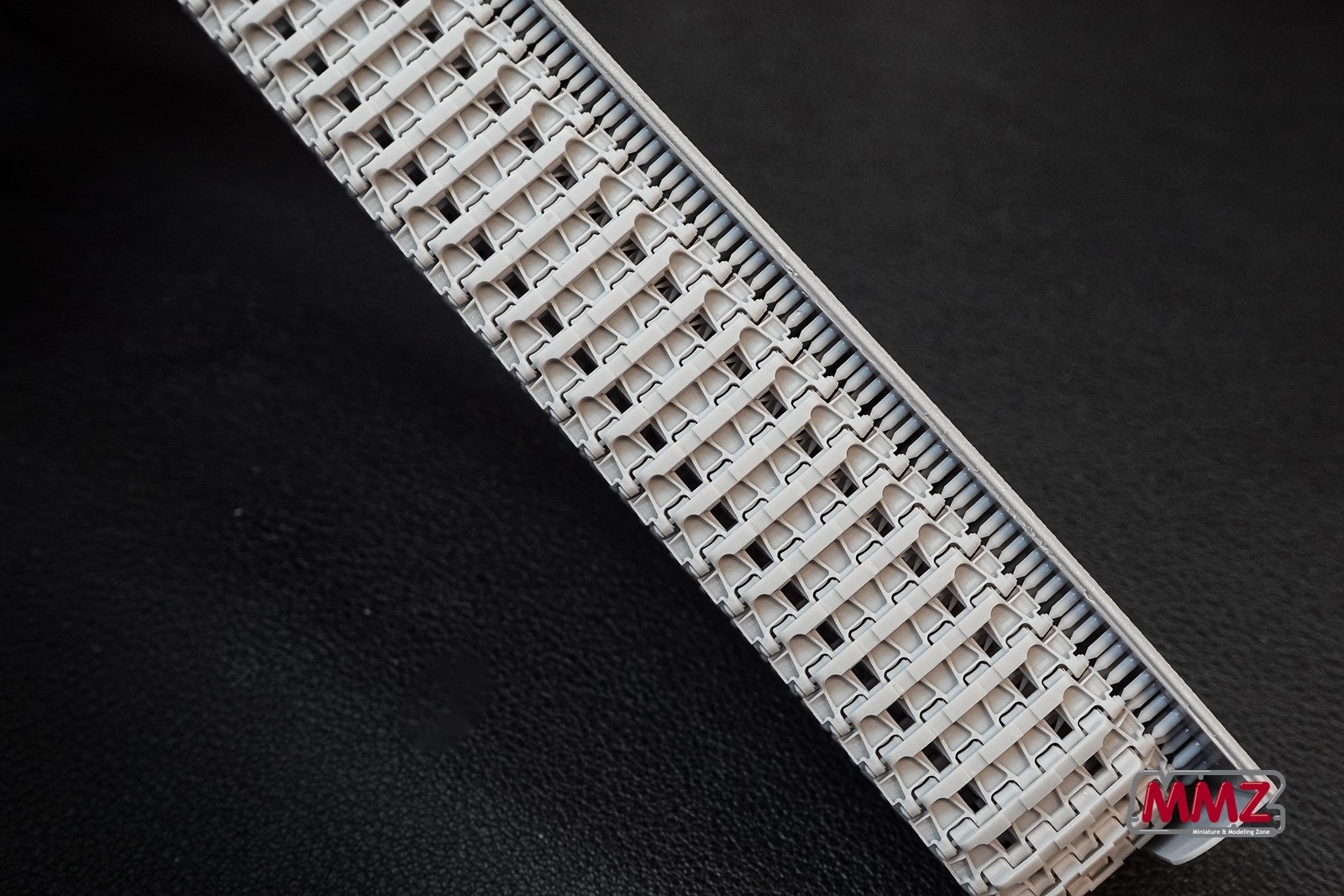제품 구성은 사진과 같습니다. 한 덩어리로 프린트된 트랙, 몇 개의 황동핀이 구성에 전부입니다. 트랙은 양쪽(판터는 연결핀 때문에 좌우 트랙이 구분됩니다) 한조(86개)가 가지런하게 서포터에 붙어 있습니다. 가운데에는 낱개 트랙 몇개가 보이는데 설명서에서는 보수용 트랙이라고 합니다.