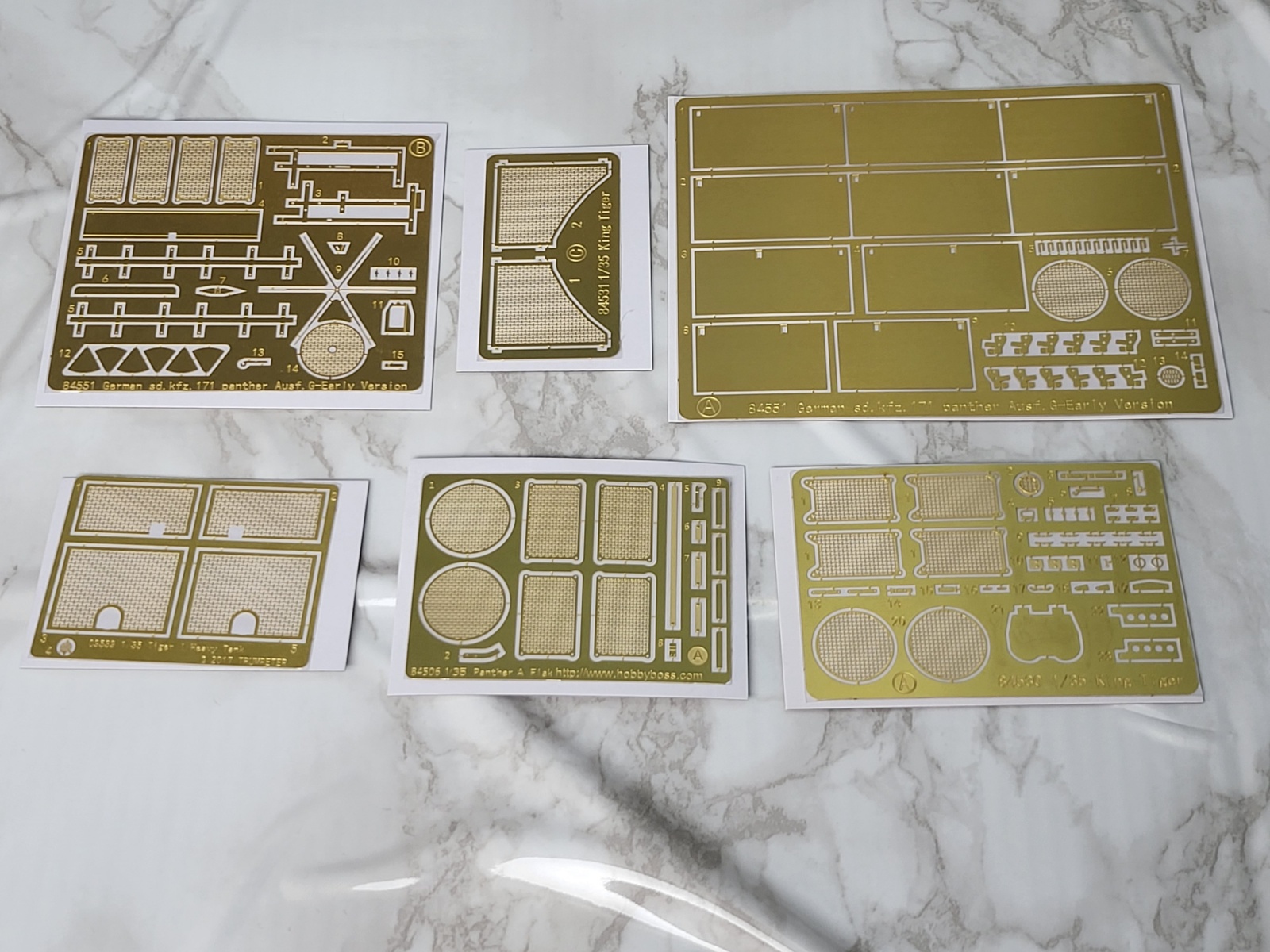 기존 하비보스 제품들의 킹타이거 판터 A형 G형 엔진 그릴과 트럼패터 타이거 전차의 엔진 그릴, 이렇게 4대분 6장의 에칭판 구성입니다.
