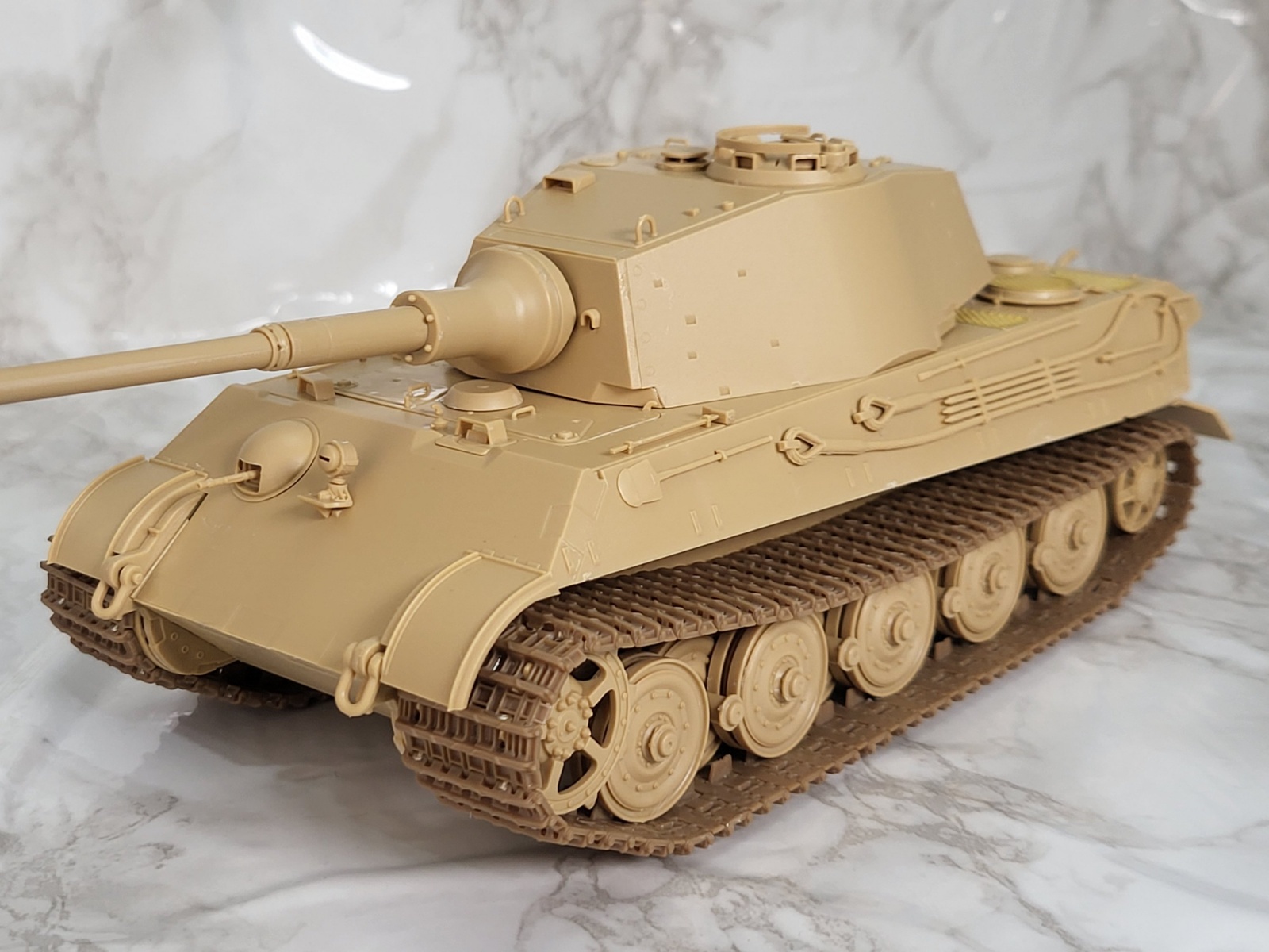 아카데미 킹타이거 제품의 경우 대전 말기 형식을 재현하면서 드문 형태의 엔진 그릴과 폭 좁은 운송용 트랙이 들어있는데, 이 제품들을 활용하면 우리에게 낯 익은 형태의 킹타이거로 적용 가능합니다.