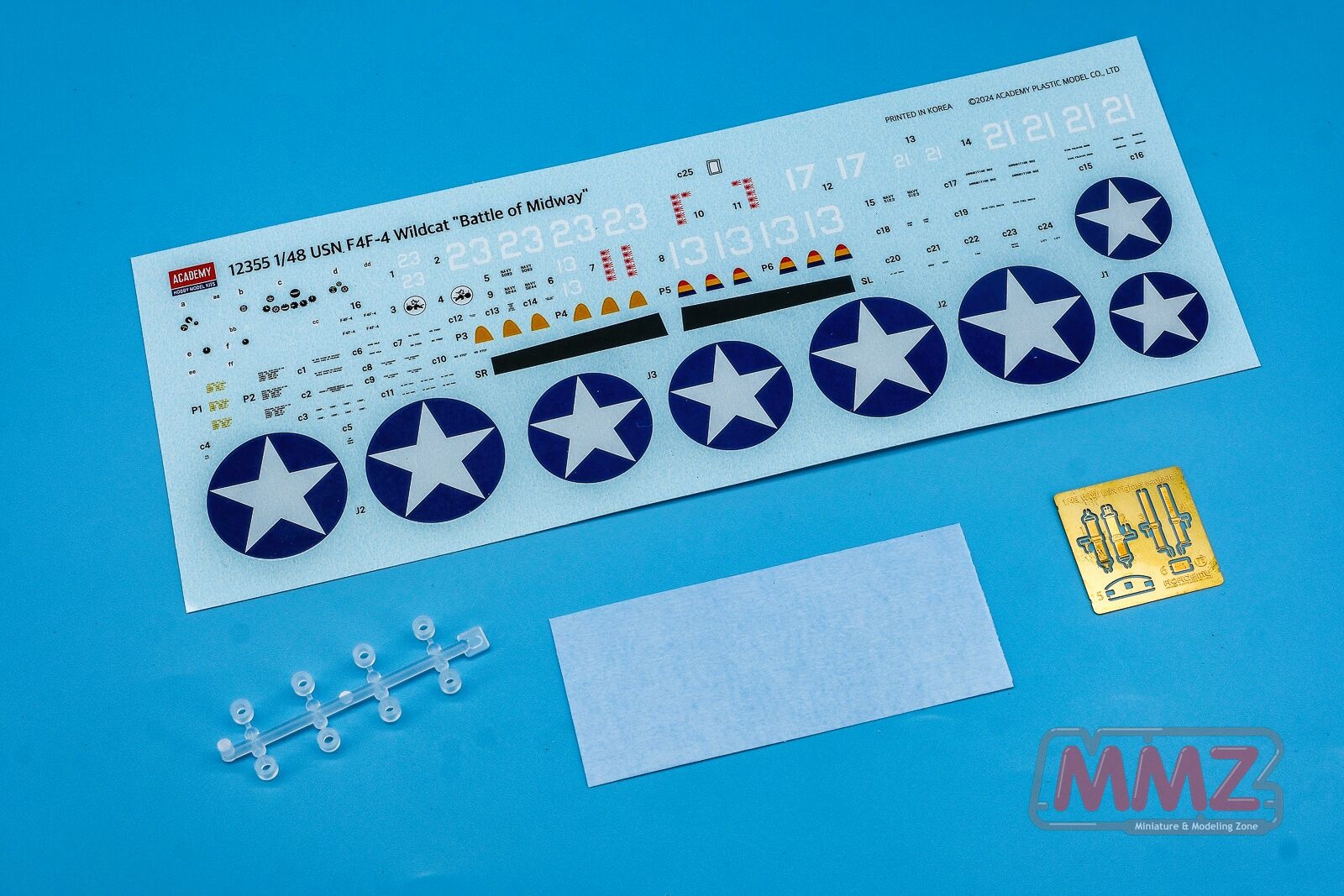 거대한 크기의 데칼과 프로펠러를 고정하기 위한 폴리캡, 시트 벨트를 재현하기 위한 애칭, 캐노피 도색용 마스킹 실이 포함됩니다.