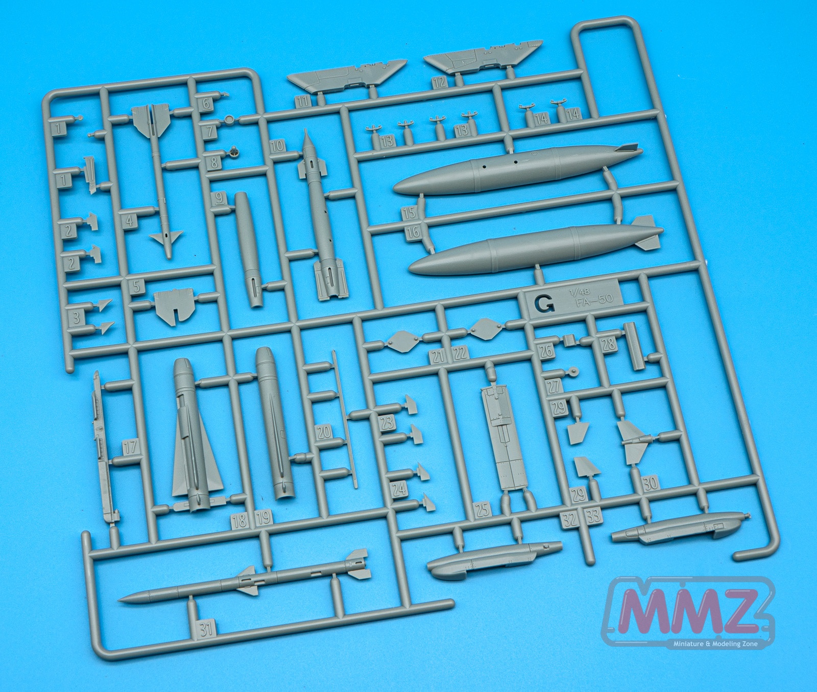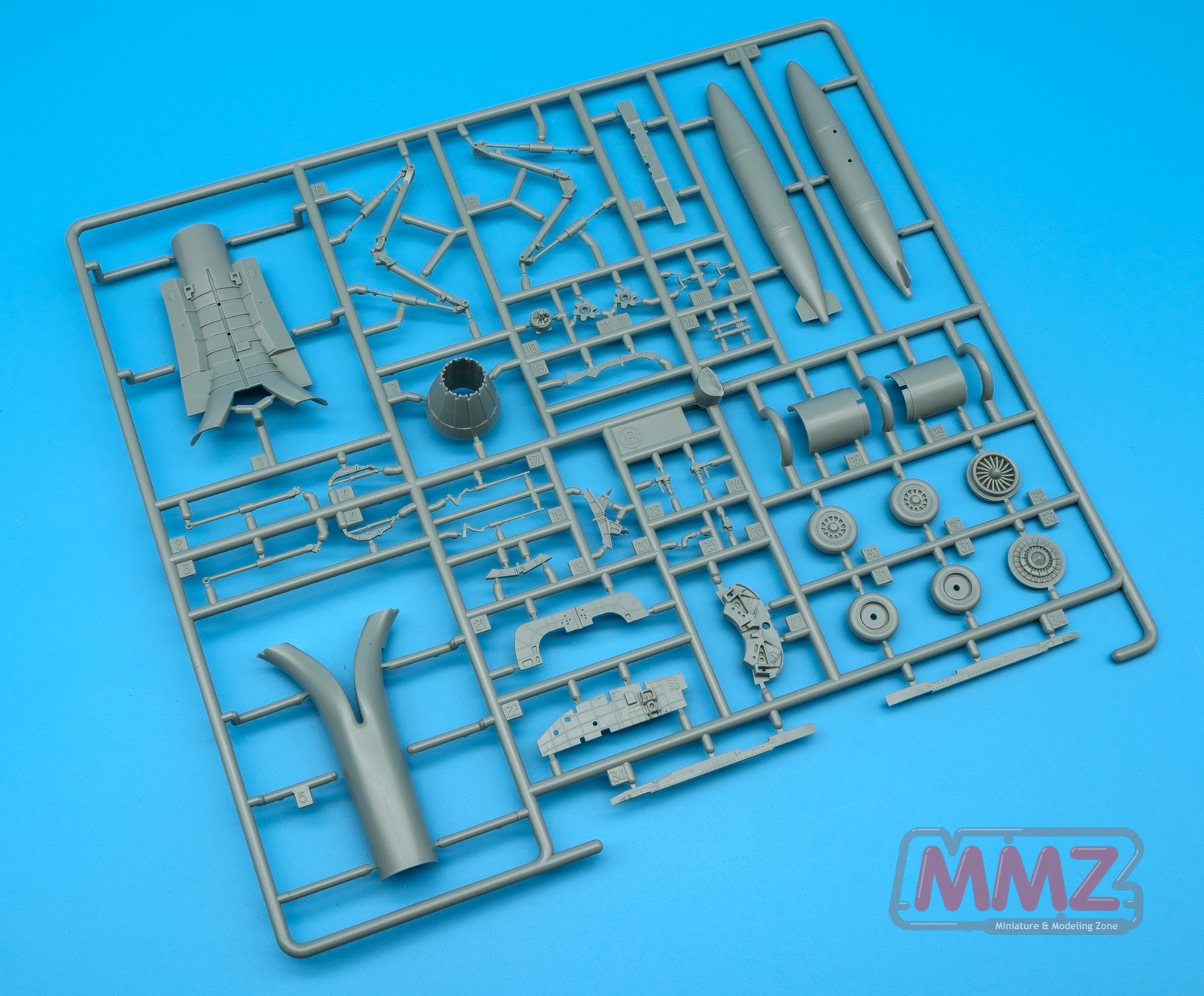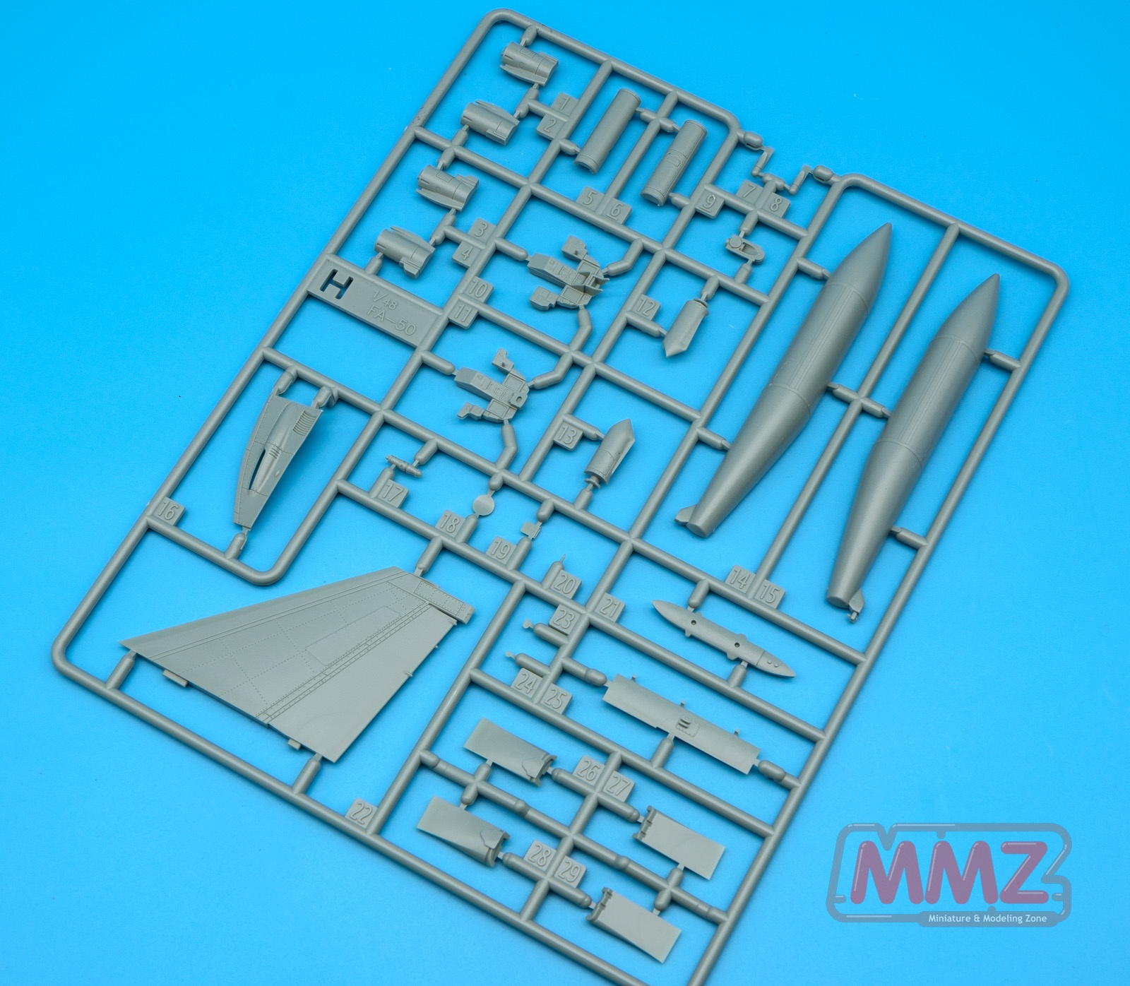 H 런너가 FA-50을 위해 새로 제작된 부품 중 하나입니다. 수직 꼬리날개, 계기판, 기총 패널, 펼친 상태의 에어 브레이크등이 보입니다.