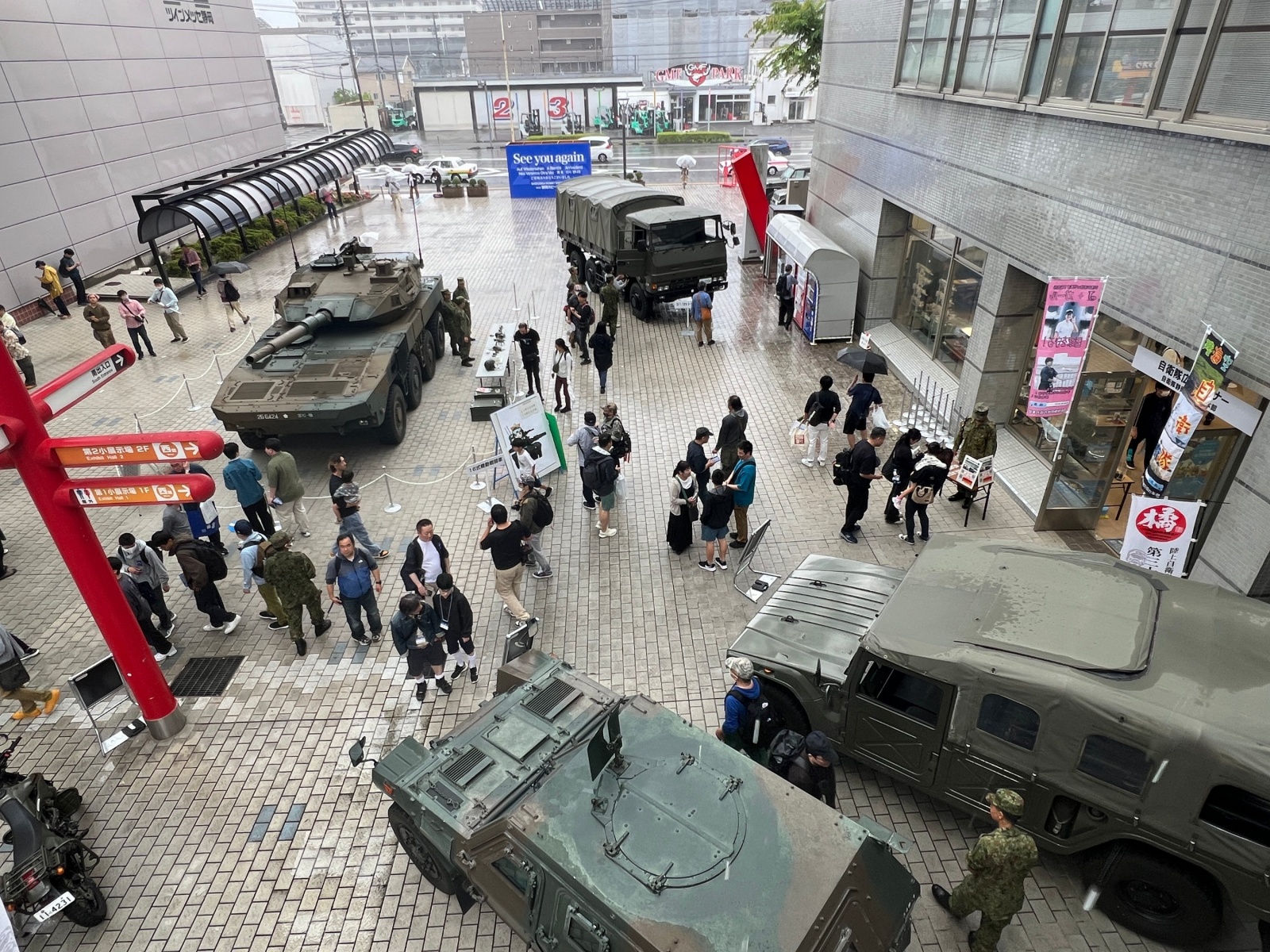 잠깐 밖으로 나와서 찍어본, 2층에서 본 자위대 차량들.