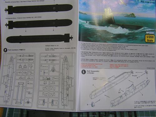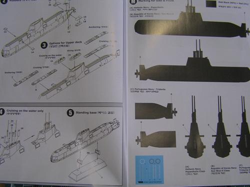 설명서 . 간단한 잠수함 이다보니 설명서도 단촐 합니다. 세개 국가의 214급을 재현할 수 있도록 하고 있는데 사실 차이가 거의 없습니다... 국내에선 4번함인 김좌진함 까지 진수되었는 데 이들 간의 외관상 차이점도 입구 위에 손바닥만하게 붙어있는 명판이 전부 더군요. (너무 작아서 키트엔 재현되어있지 않음)