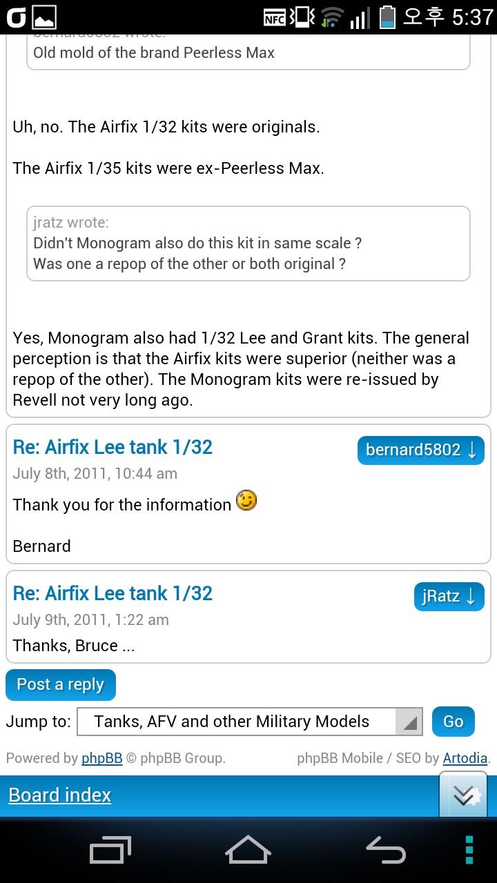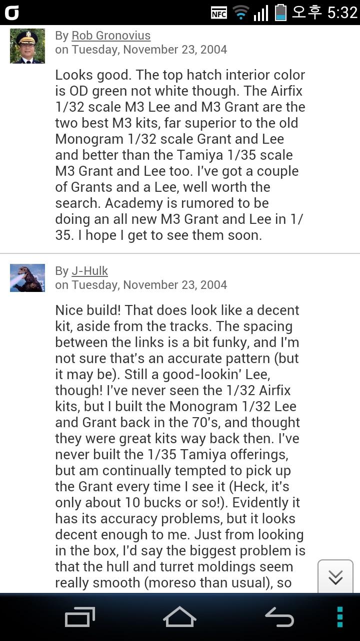 해외 포럼의 평판입니다... 우리는 비교해 봤기에 무조건 에어픽스가 낫다는 주장에는 GRANT에 대해서는 동의할 수 없습니다만 전체적으로 우수한 것은 틀림없고 곧 올리겠지만 LEE 전차의 경우는 에어픽스가 모든 분야에서 앞섭니다.