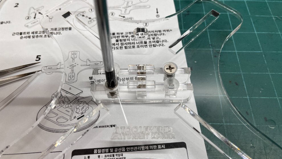 두개의 부품사이에 금속부품을 끼워서 본체의 베이스에 끼운 후 잠금너트와 접시머리나사를 잘 연결해서 조여줍니다.