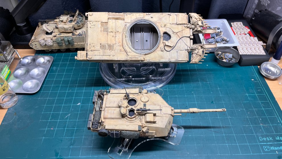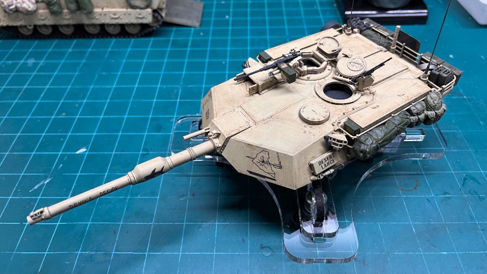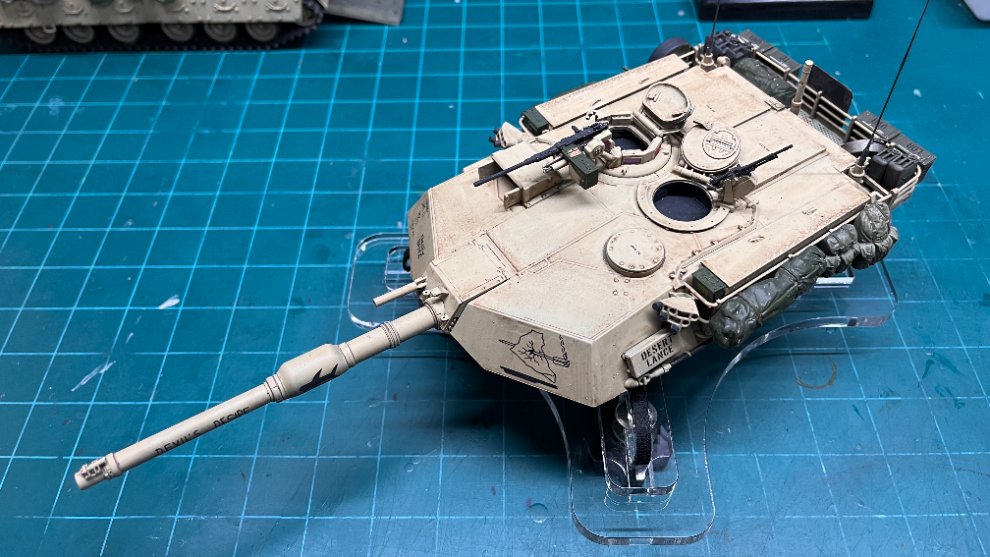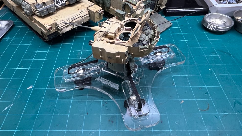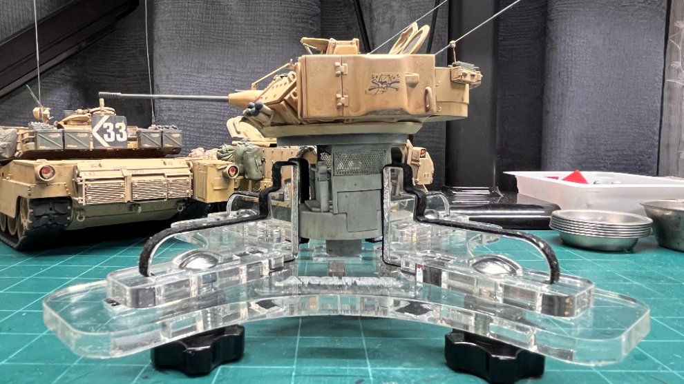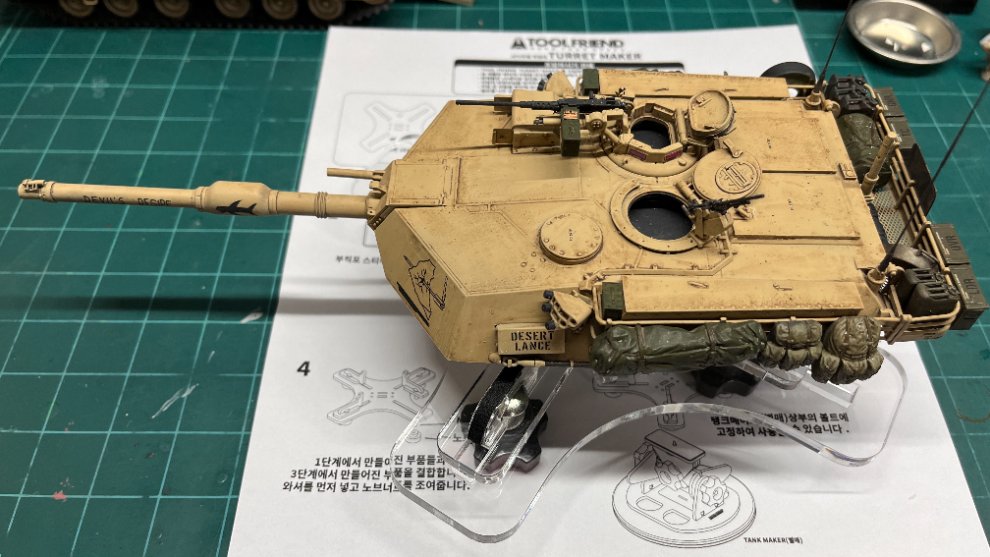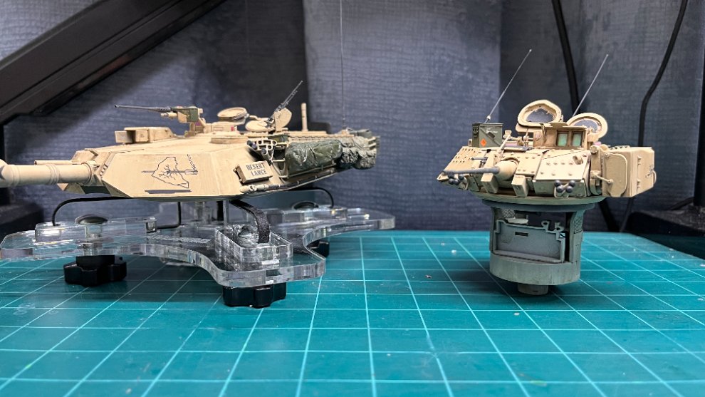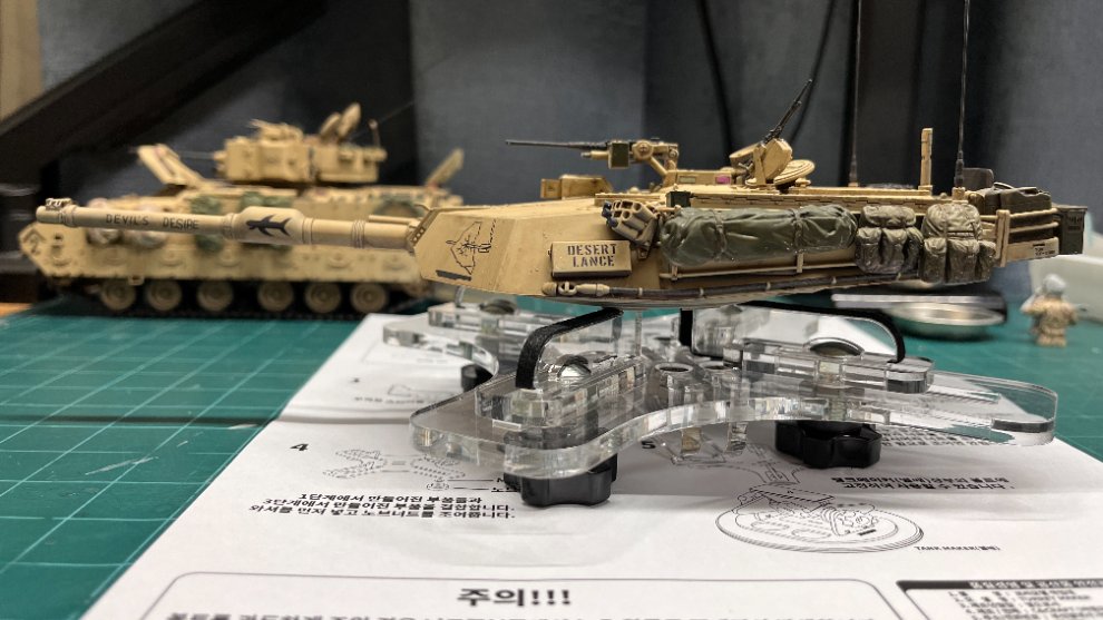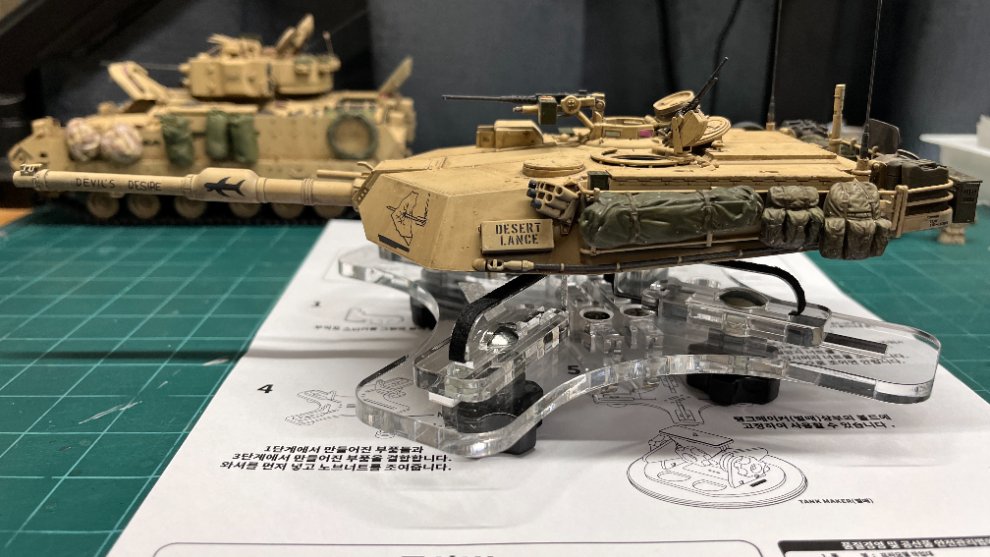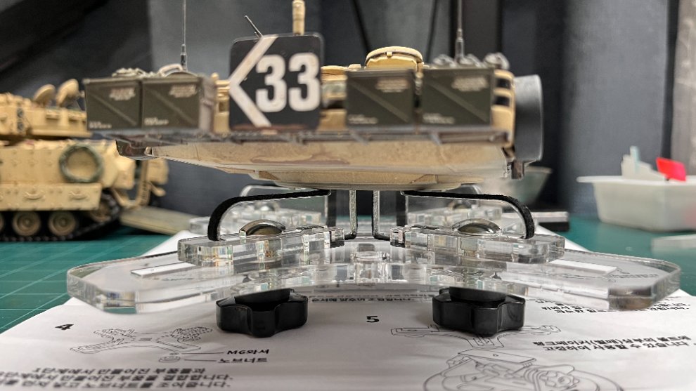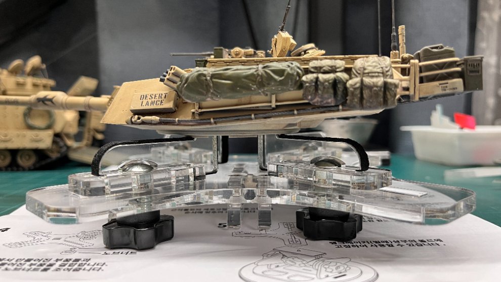 사진의 에이브람스처럼 포탑이 큼직한 전차도 바닥의 지지대가 충분히 큼직해서 뒤뚱거리지 않고 잘 고정할 수 있습니다. 사진에는 없지만 앞서 발매된 Tank Maker의 상단에 이 Turret Maker 하단을 고정해서 책상에서 높이를 훨씬 높게 만든 상태로도 사용이 가능합니다. 그동안 포탑의 도장이나 워싱, 웨더링 등의 작업을 할 때 손가락을 포탑 안쪽으로 넣어 버텨가면서 작업했던 것을 생각하면 양손을 모두 쓸 수 있어서 너무 편리합니다.