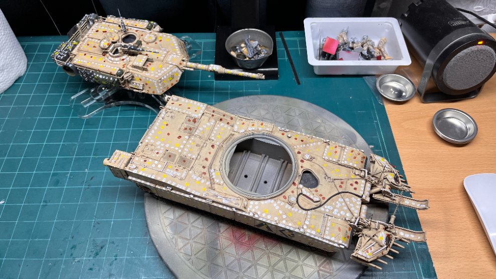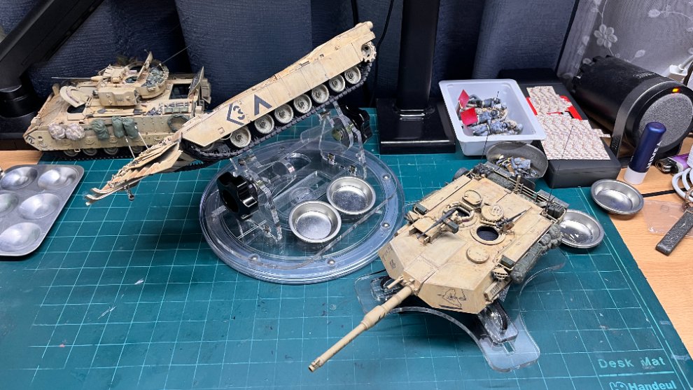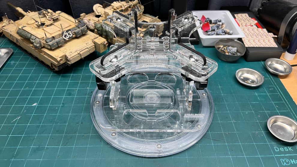 기존에 사용하던 회전판의 최대의 단점은 차체의 상면에 워싱/웨더링작업을 하기엔 좋은데 측면과 하단의 로드휠/궤도에 작업할 땐 붓이 닿는 각도가 좀 애매해져서 결국 차체를 들어야 한다는 점이었습니다.
