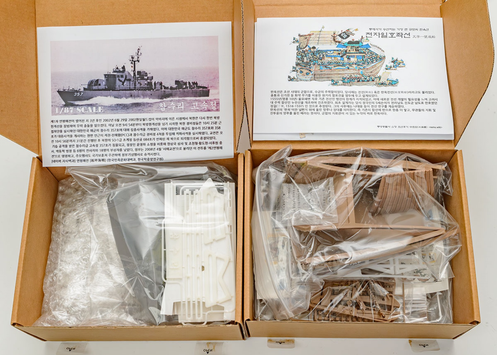 왼쪽은 참수리 고속정입니다. 오른쪽은 노량 판옥선으로 대형 판옥선입니다. 둘 다 1/87 스케일이며 길이가 45cm 가량으로 상당히 큽니다. RC 개조 옵션도 있지만 지금은 판매 중단 상태입니다.