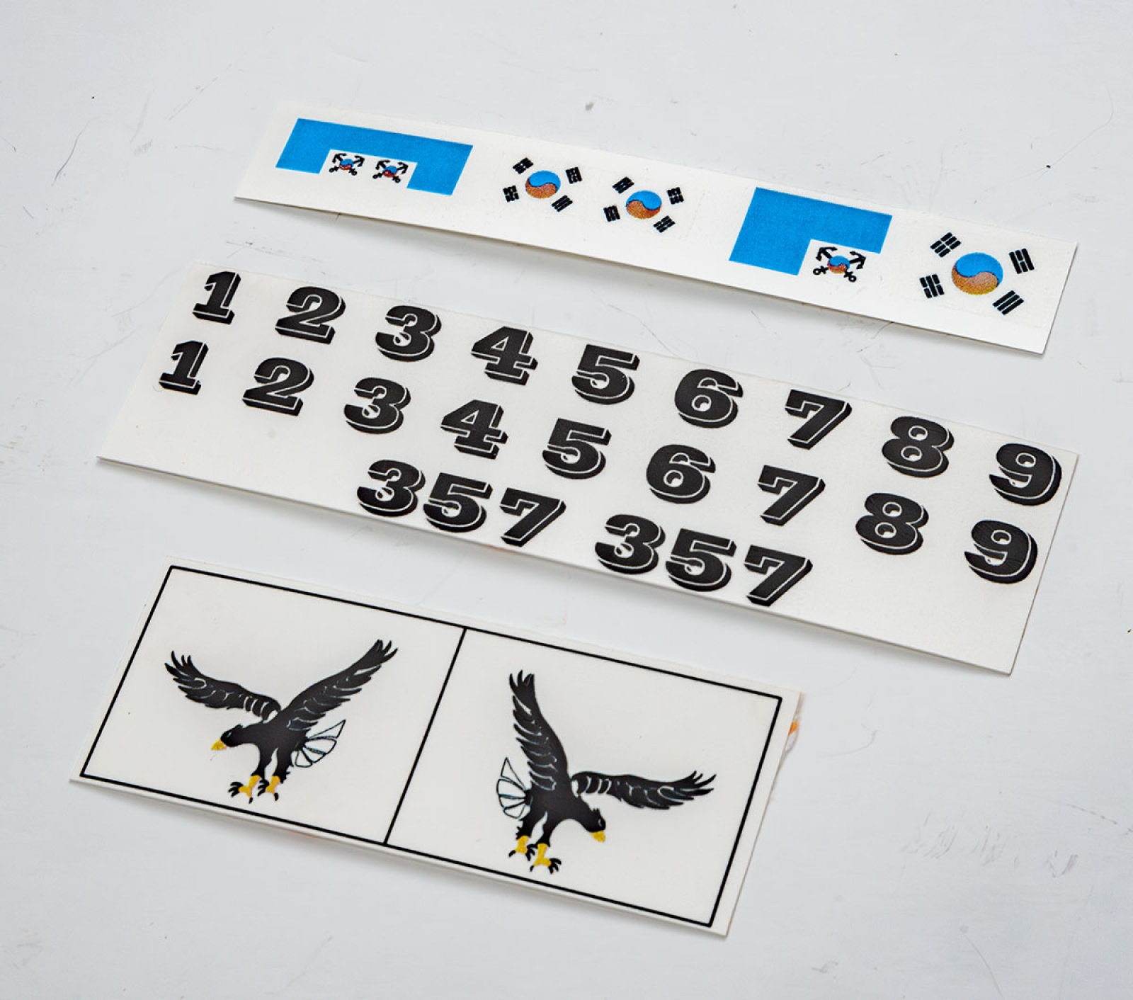 이는 의도한 색상이 아니며, 아래의 참수리 고속정 데칼의 태극기를 보면 레이저 프린터 토너의 이상으로 생긴 물빠짐인 걸 확인할 수 있습니다.