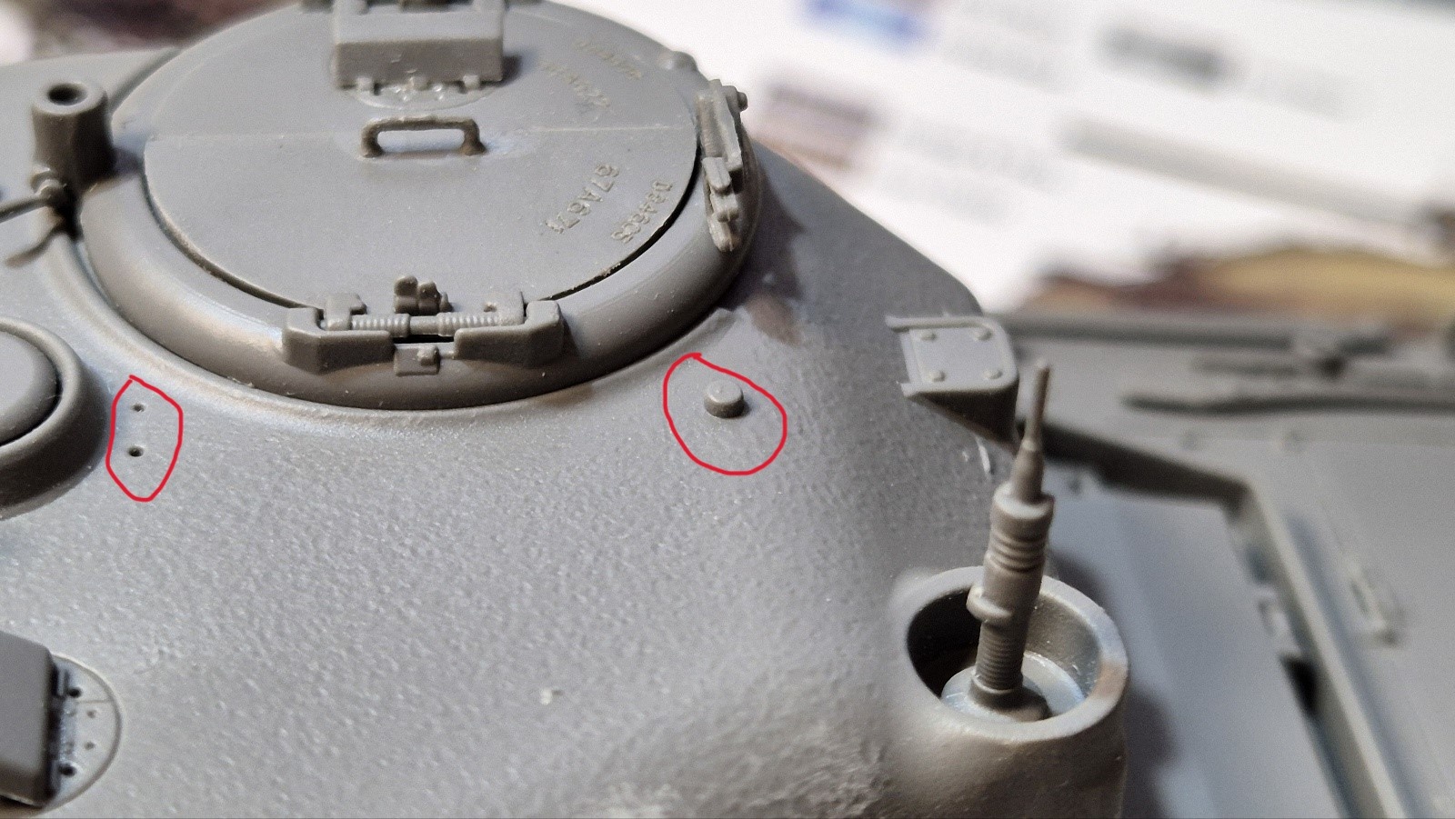 3. 없는 부품이 있음 - 관측창 윗뚜껑이 설명서와 다른게 하나 들어 있었고, 페리스코프 가드 부품이 2개 필요한데 하나밖에 없어서 다른 킷에서 빌려와 완성시켰습니다.