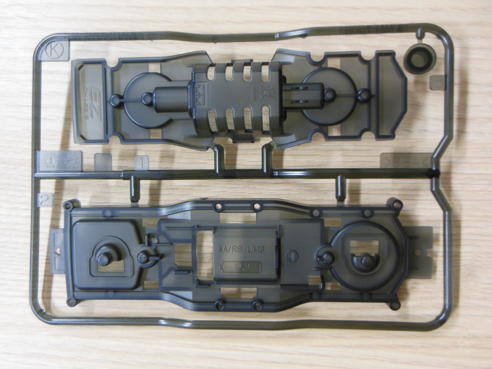 앞뒤, 위아래 구분이 안되는 샤시 부품입니다. EZ chassis라고 적힌 부분이 앞쪽이고, 윗 부품 입니다.
