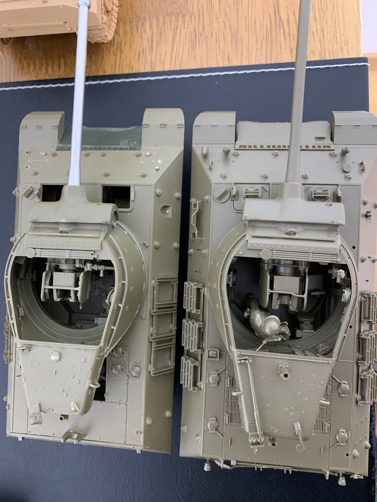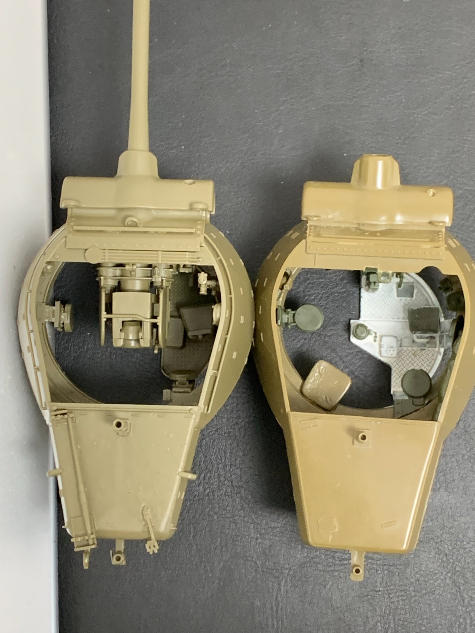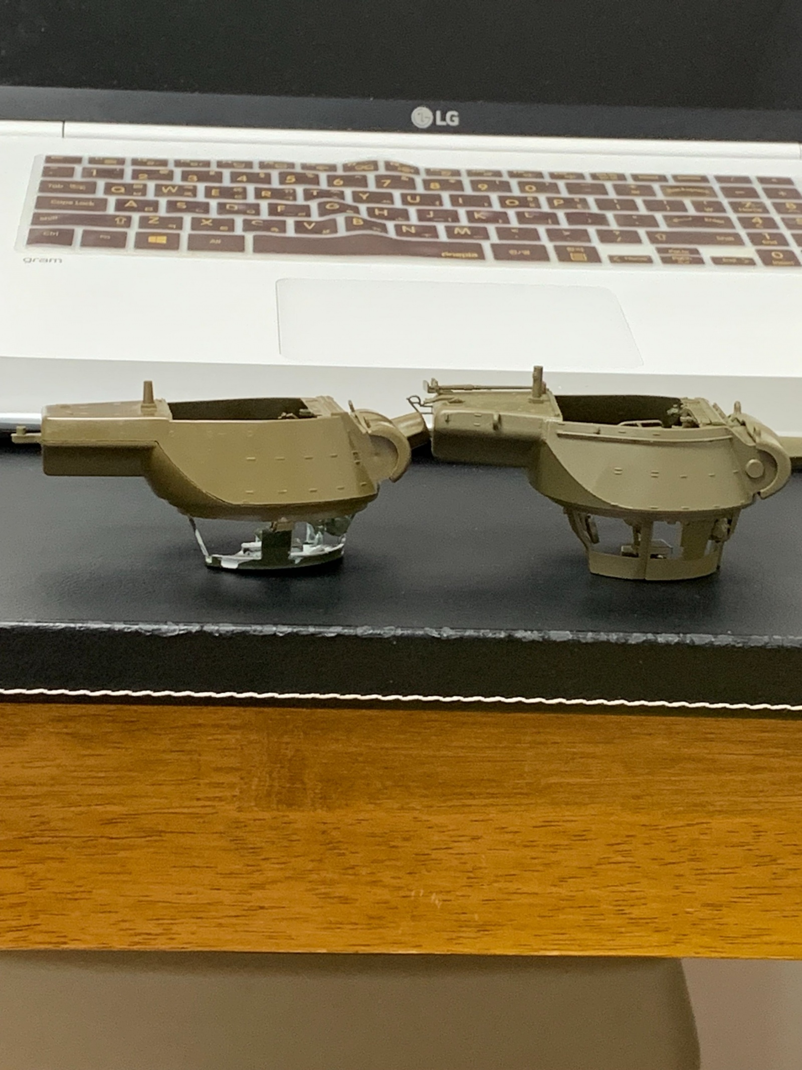 기대했던 타미야 M-36을 만들었습니다. 가장 큰 관심사는 포탑이었고 혹시나 했는데 역시나였습니다. 유승식님, 심영보님이 진행하는 유투브 채널 '디오라마 TV'에서 이 키트 포탑이 기존 아카데미나 AFV 클럽보다 크다고해서 혹시 예전 이탈레리 M-36B1 포탑과 비슷할까 예상했었는데 모양 및 크기가 거의 같습니다. 모 외국 사이트에서는 이탈레리 포탑이 스케일에 비해 크다고 나왔었고 이를 철석같이 믿고 있었는데, 실물 취재로 만들었다는 타미야 포탑이 정확하다면 이전 이탈레리 포탑도 정확해 보입니다. 누가 포탑 길이를 실측한 자료가 있으면 좋겠는데 구할 수가 없네요. 인터넷에 떠도는 여러 간이 도면들은 신빙성이 떨어져서 믿기가 어렵습니다. 아래 사진 네장 가운데 위 세장은 이탈레리와 타미야 포탑을 같이 찍은 것인데 디테일은 타미야가 우수하지만 전체 크기 및 윤곽은 상당히 비슷합니다 (혹시 많이 달라보인다면 사진 잘못 찍어서 그런 겁니다). 참고로 이탈레리 바스켓은 아카데미 것을 갖다 붙인 것입니다. 맨 마지막 사진은 타미야(오른쪽)와 AFV 클럽(왼쪽)을 비교한 것인데 AFV 클럽이 전반적으로 작습니다. 아카데미 포탑도 있었는데 지금 못 찾겠네요. 기억으로는 AFV 클럽 포탑과 비슷하거나 약간 더 컸던 것으로 기억합니다만 확실한 것은 이탈레리 포탑보다 작았습니다. 천덕구러기 신세였던 이탈레리 포탑 다시 손을 봐주어야겠습니다. (참고로 타미야 M36 앞에서 봤을 때 왼쪽 트랙 만들 때 아이들러휠 고정 축을 미리 붙여놓지 않고 트랙 이어 붙일 때 길이 조정해서 아이들러휠 고정축 붙이는 곳 홈 끼우는 곳 깍아낸 뒤 회전 시켜 붙여준 것입니다, 실제로 좌우가 같기 때문에 이런 문제가 없어야 하는데 트랙 연결할 때 트랙과 트랙 사이 간극 조정이 달라져서 생긴 문제입니다만 다 붙여 놓기 전에는 알 수가 없기 때문에 위 아이들러휠 고정축 부품을 조금 손 본 뒤 미리 붙이지 않고 조정한 뒤 붙이는 것이 좋습니다.)