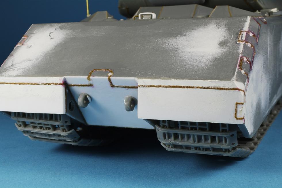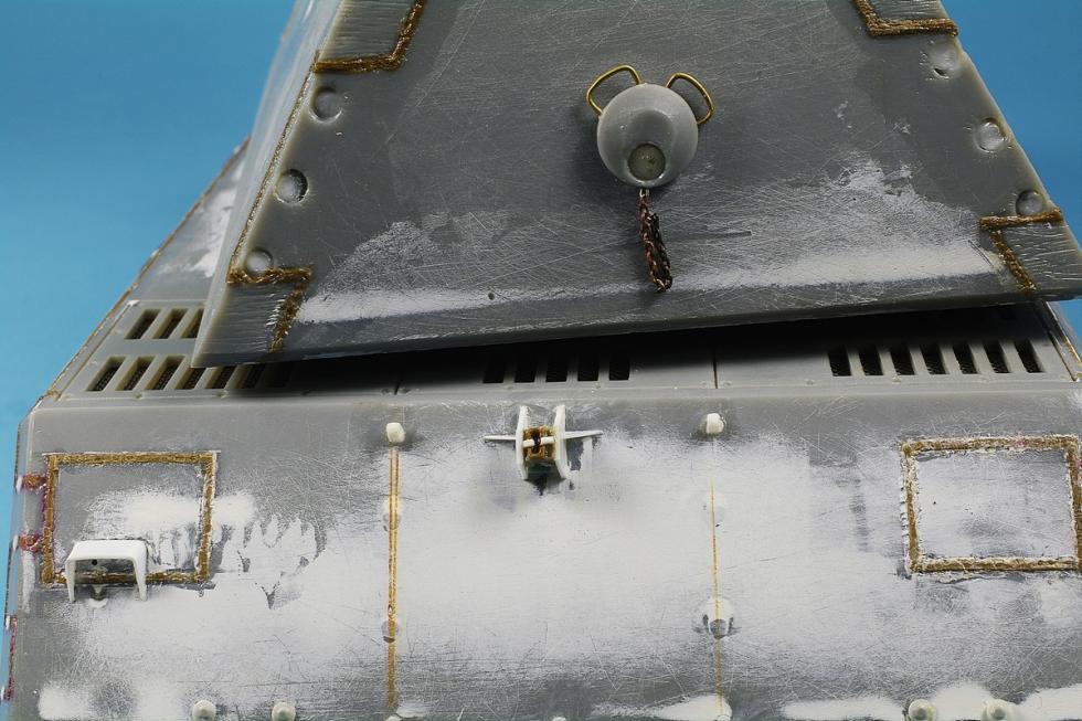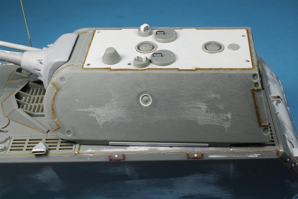 주포 방패 모양 조금 더 손보았고,포탑상판은 실제사진을 보면 조금 도드라져 있는 듯 한데 키트는 평면이라 플라판으로 만들어 주고 주위에 용접선 추가 했고,잠망경들은 기존 드래곤 키트의 것들을