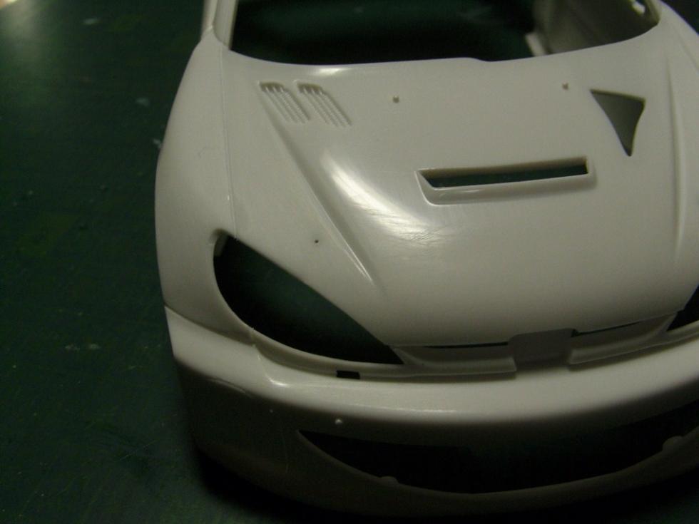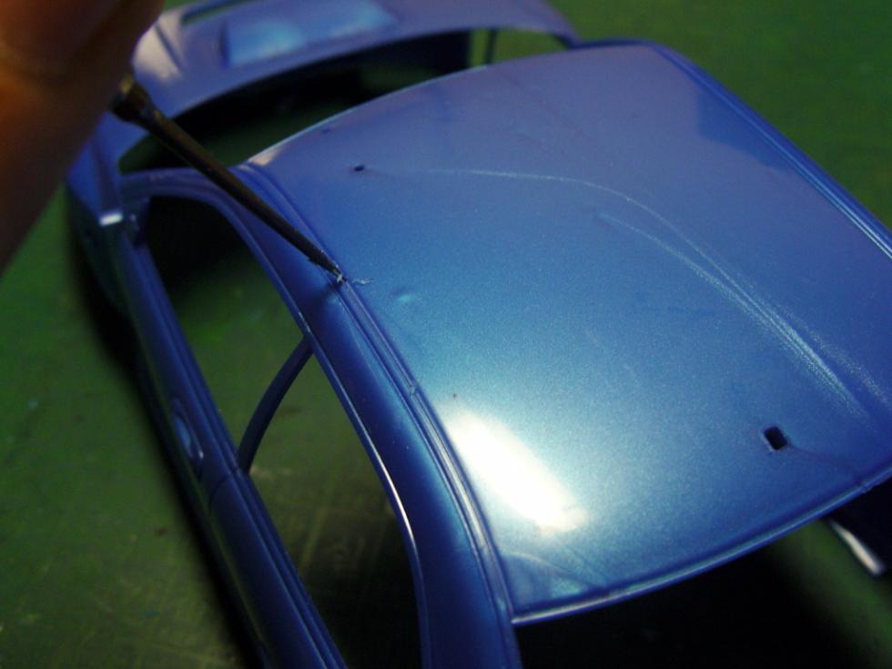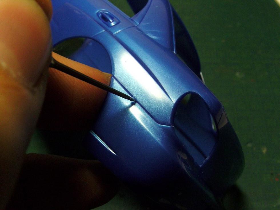 라인등은 철필로 뚜렸하게 다시 한번 파주고.. 본넷핀이 들어가는 자리는, 아예 핀바이스로 뚫어버렸습니다.(나중에 에칭 본네트핀을 달기위해.)