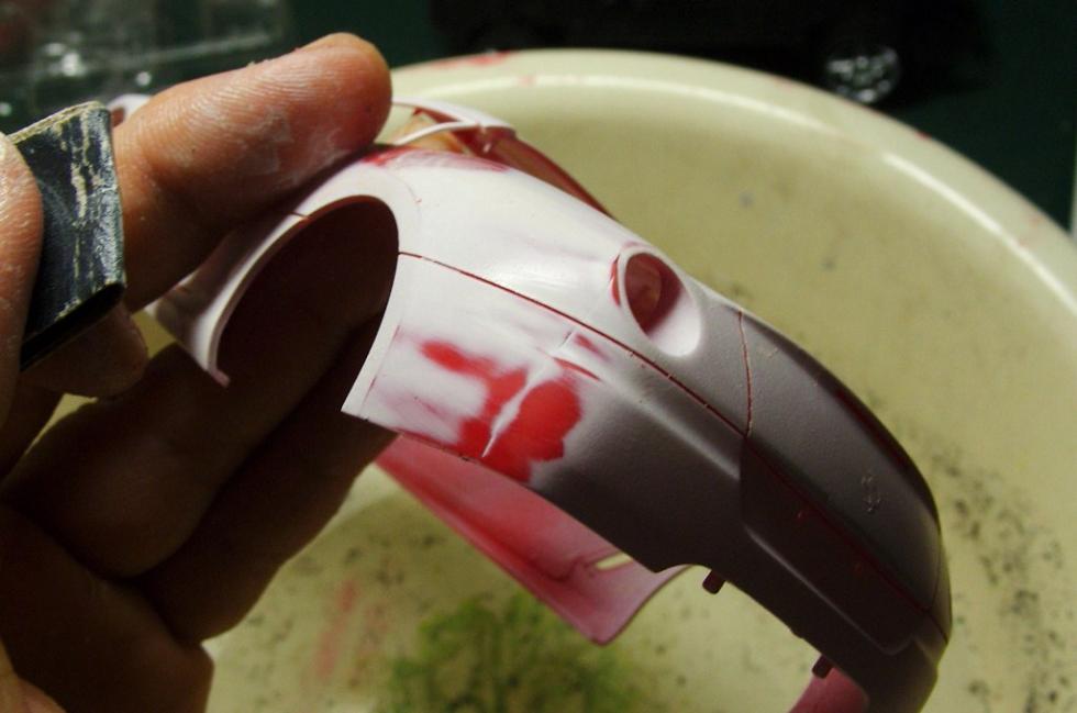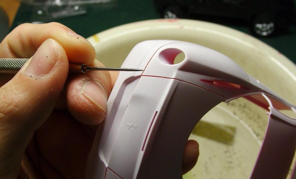 사진에는 없지만, 바디전체를 사포로 다듬은 다음, -> 화이트 서페이서를 뿌린 후 -> 철필로 몰드를 파주고 있는 사진 입니다.