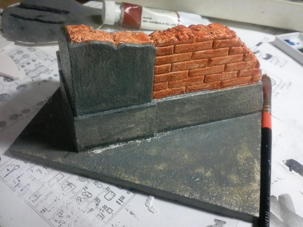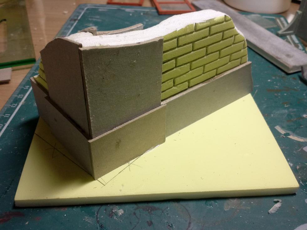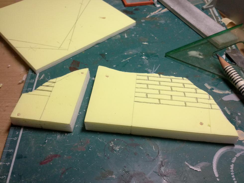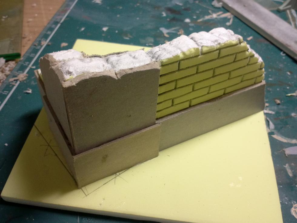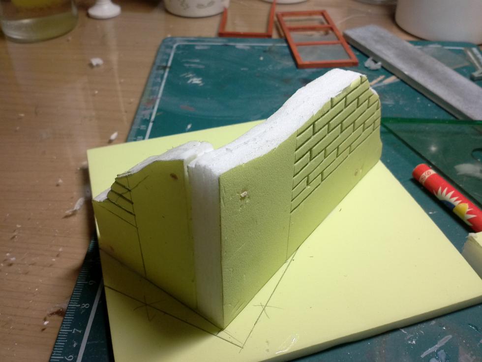 벽체위의 단면을 조각해 줍니다. 일반적으로 조적식 건물은 벽돌 두세장으로 짓겠지만 모형상 두꺼워 보여서 벽돌한장 두께만 표현합니다. ㅎㅎ