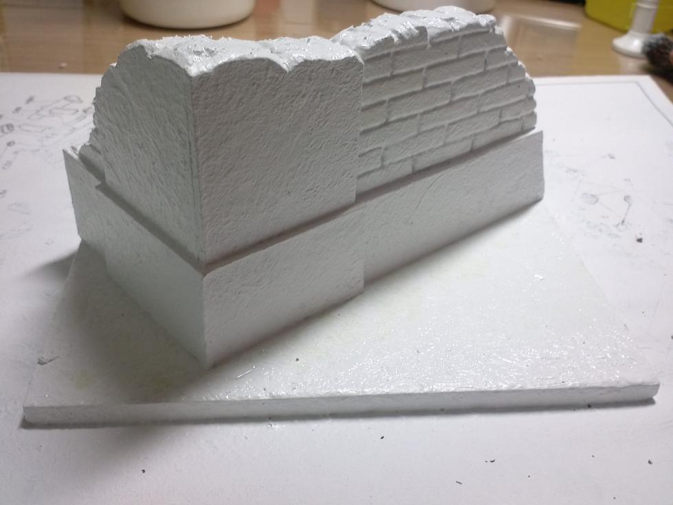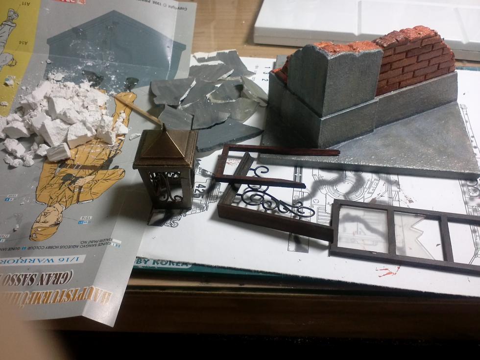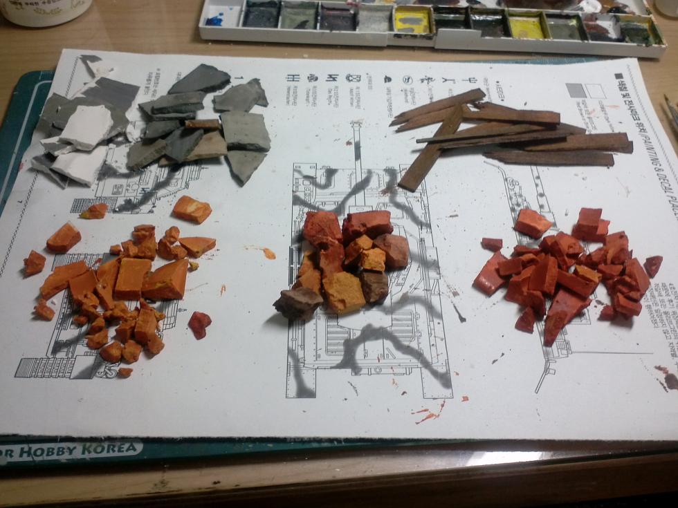 준비된 건물 파편들, 얇게 굳힌 석고, 나무판, 벽돌잔해등...