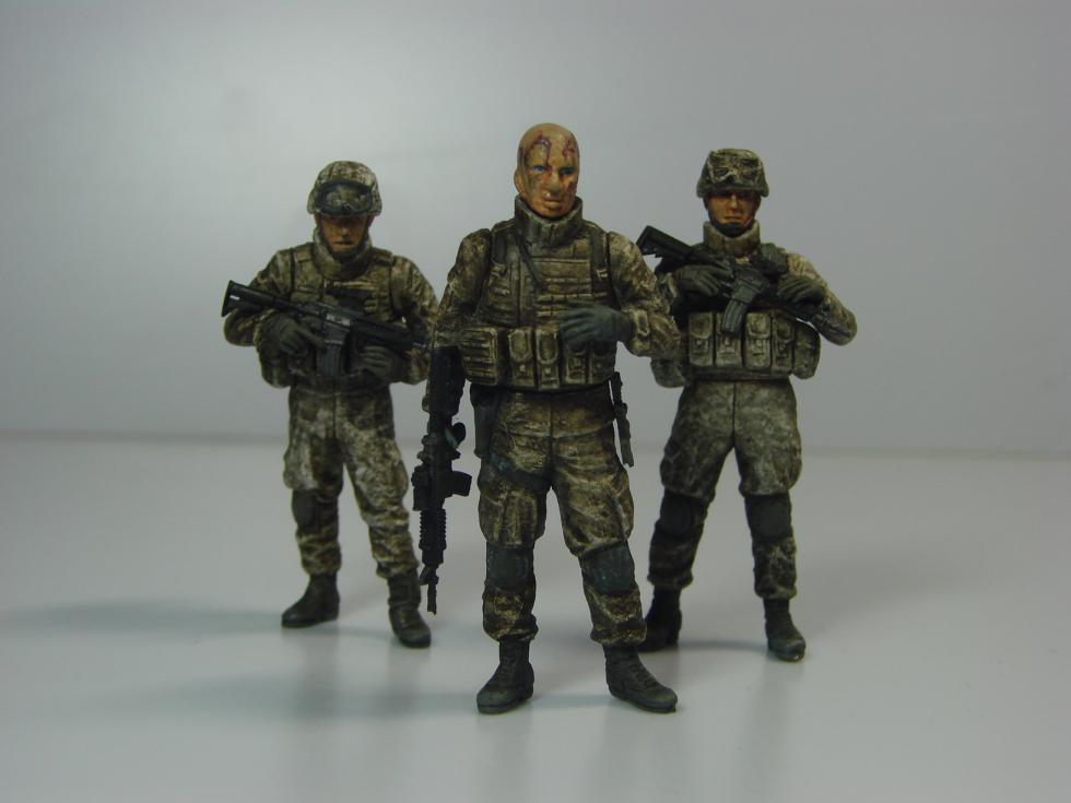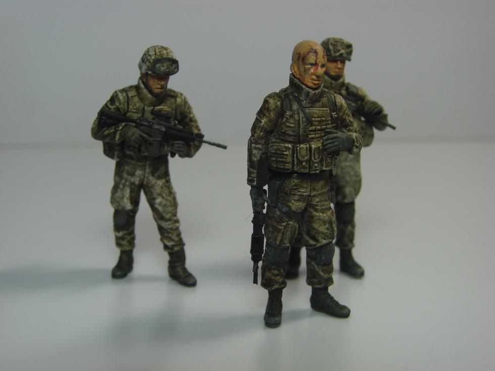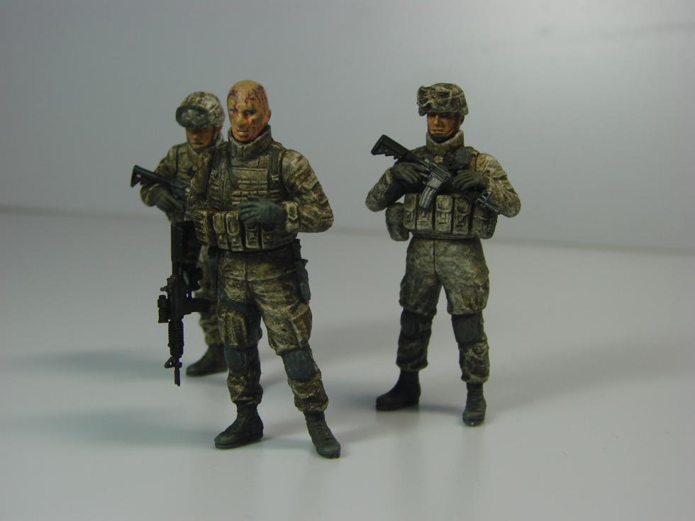 왼쪽의 상체를 살짝 숙인 병사는 원래 지원화기 사수인데, 팔을 개조해서 소총수로 만들었습니다. 무릎보호대가 발목까지 흘러내린 상태로 조형된 게 재미있네요.
