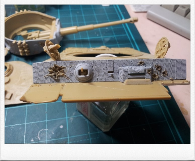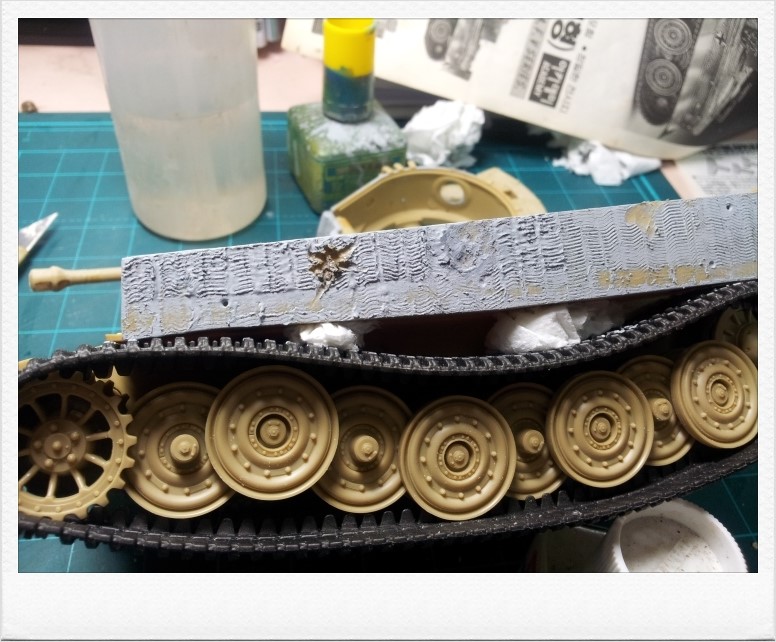 타이거원에 대해 공부하다보니 초창기 타이거원이나왔을 대구경 전차포가 없어 소수경인 연합군 전차가 몇대나 붙어야 겨우 잡을 수있었다고 하더군요,, 그래서 제일 선두에 섰던 타이거의 특성상 엄청난 포탄 세례를 받은것은 당연한 일인것 같아 피탄 자국을 많이 만들어 보았습니다 작품의 설정상에도 노련한 호랑이를 잡다가 도저희 안되 결국은 함정을 파서 잡는 설정이라 노련하면 경험과 상처가 많은 것이 당연할터, 훈장을 많이 달아보았습니다