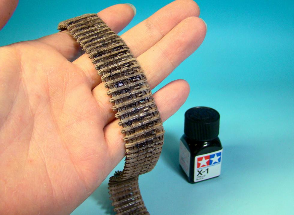 밝은 모래색인 락카 TAN을 트랙 양쪽 가장자리에 뿌립니다. 그러면 흙 묻은 질감표현이 조금 풍부해지고,트랙의 입체감이 살아납니다.