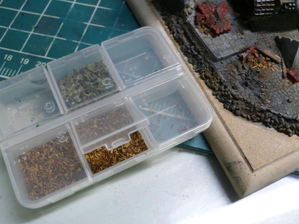 건물 잔해 사이사이에 나무 파편을 넣을려니 마땅한 재료를 찾기가 참 힘들더군요. 이쑤시게나 발사나무판을 쪼개서 올려봤지만 1/72 스케일 특성상 자연스러운 재료를 찾기가 참 힘들었습니다. 그러던중 책상을 정리하다 작년에 혹시 쓸일이 있을까 싶어서 말려놨던 .. 녹차,마테차,홍차..티백 내용물을 발견했네요.. 사진처럼 잘 보관해 놨더군요 ^^; 그중에 중간에 있는것을 적용해 보았습니다. 시간이 오래지나 어떤 차인지는 기억이 나지 않네요 .. 루이보스인가.. 마테차인가 ㅡㅡ;;.