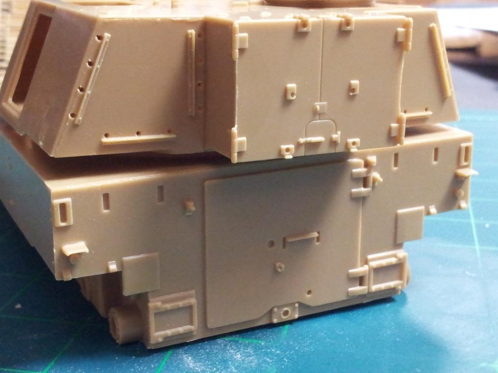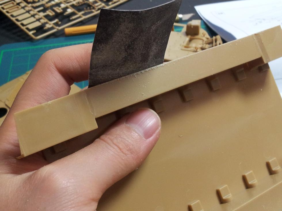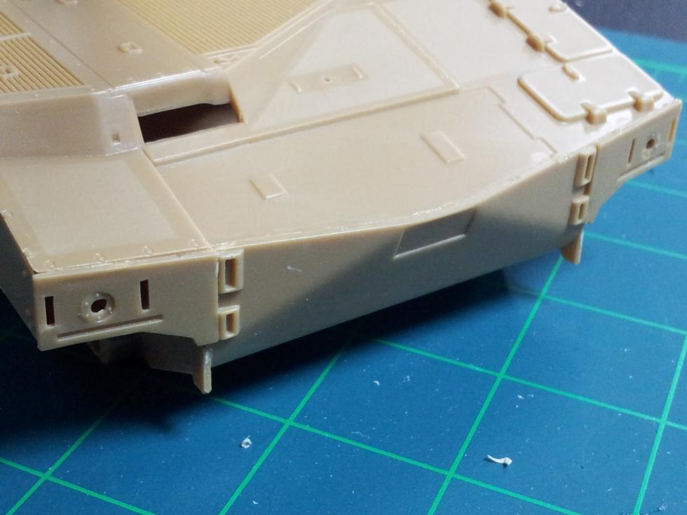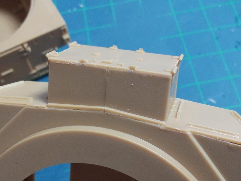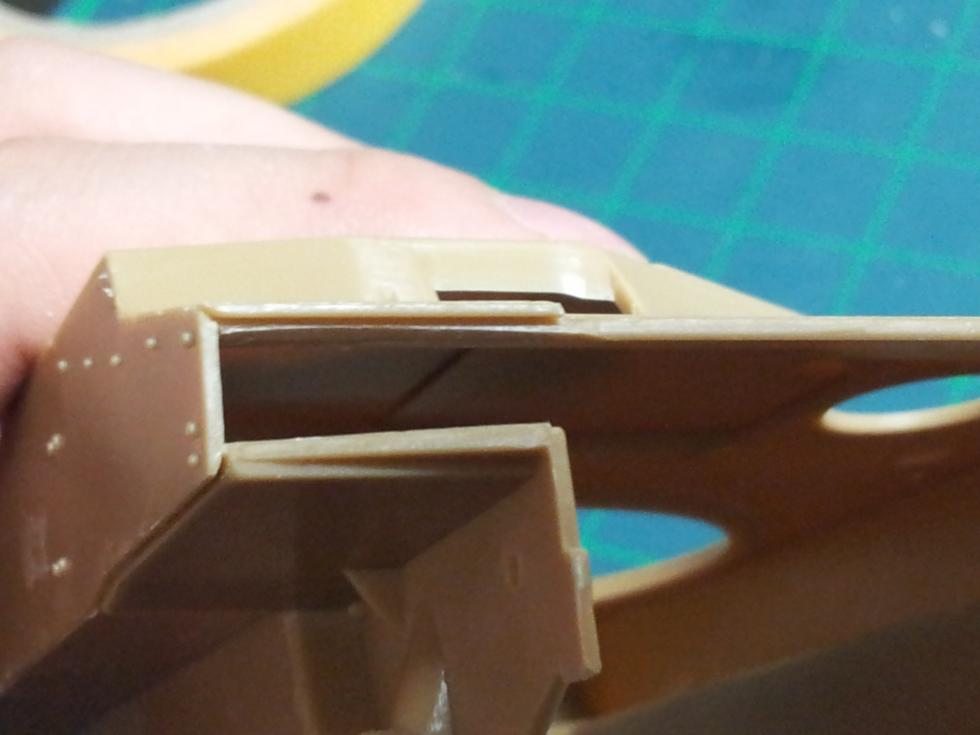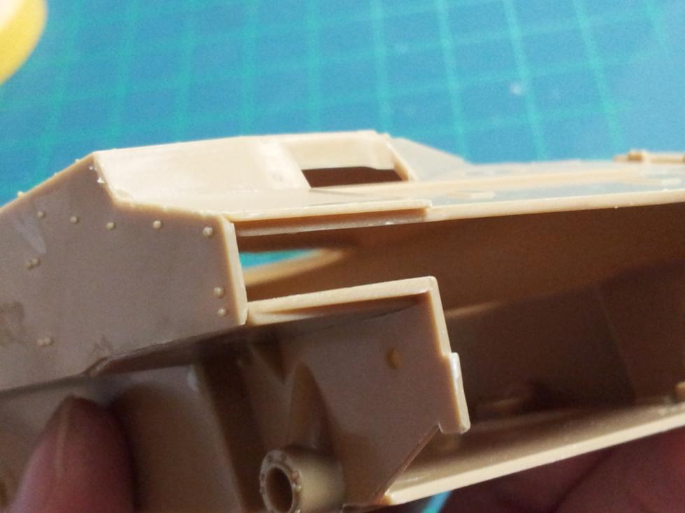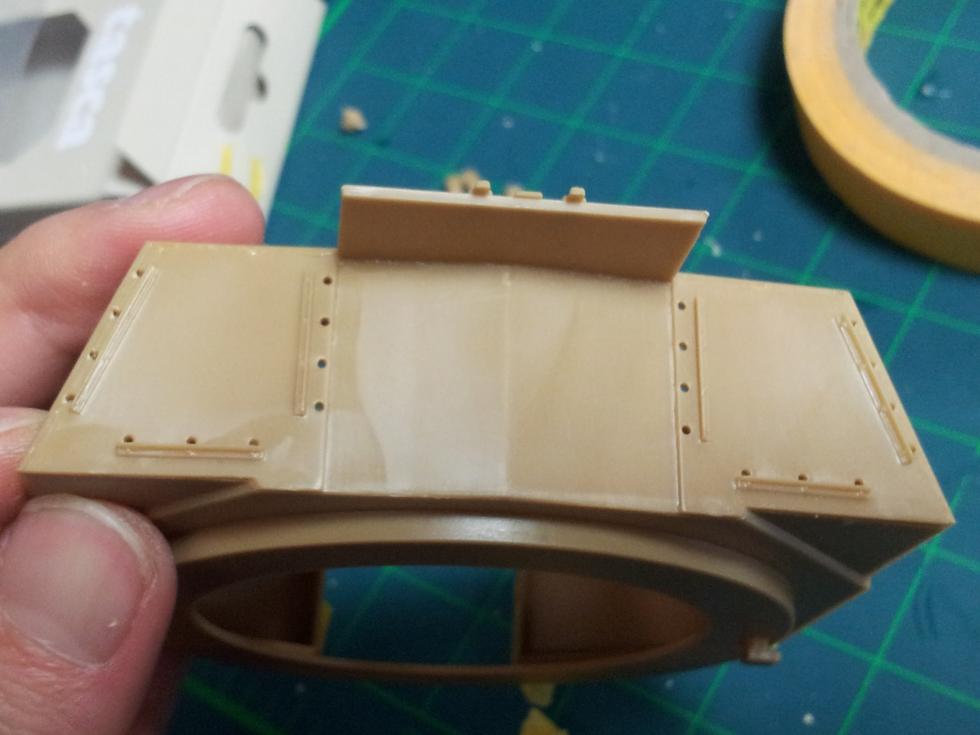상면 장갑판에 조립용 턱이 있는데 차체 상판의 턱과 높이가 안맞아 조립하면 아래로 밀려내려 갑니다.. 그래서 저부분을 좀 잘라내거나 자체 상판의 턱을 잘라내던가 하면 됩니다..