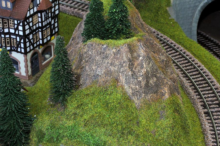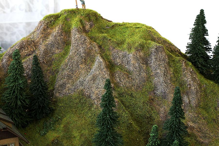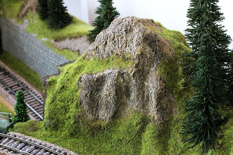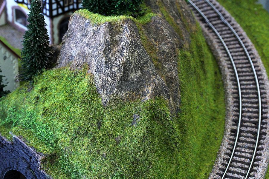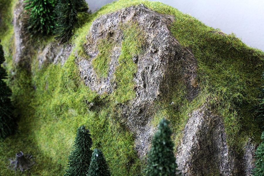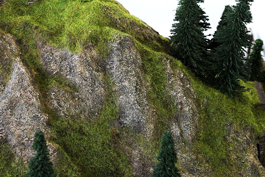 지난 주말 부터 시작 해서 어제 까지 완성 한 바위산 모습 입니다. 바위 산 의 웨더링 은 기본색, 드라이 브러싱, 블랜딩, 워싱 등 의 여러단계 를 거쳐 최대 한 자연 의 모습 을 표현하고자 많은 노력 을 하였습니다. 바위 웨더링 후 Noch 2.5mm 낮은 잔디 로 산 등선 및 주변 의 풀지대 를 표현 해 주었습니다.