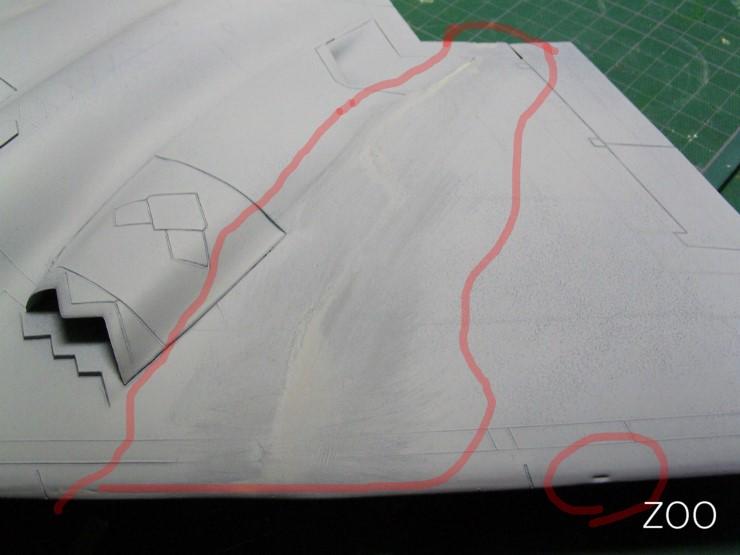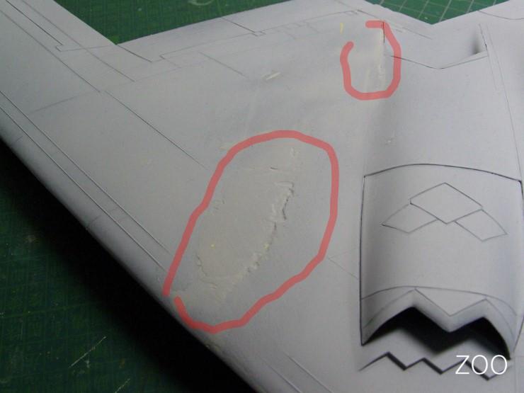 줄사포로 순간접착제를 갈아낸 뒤, 폴리퍼티로 1차 메꾸고, 서페이서 도포후에 타미야퍼티로 한번 메꿔준 후의 사진입니다.