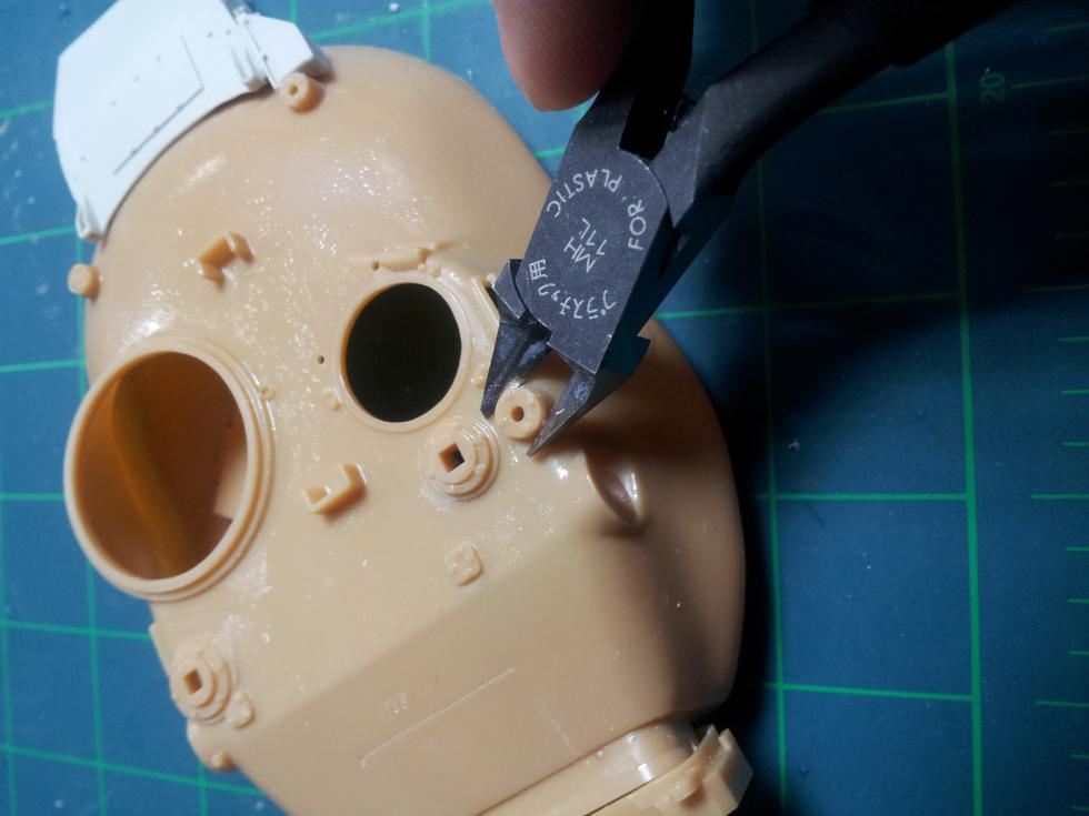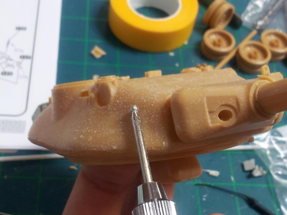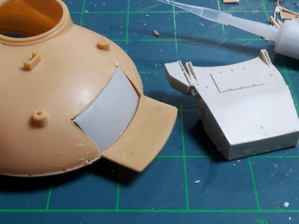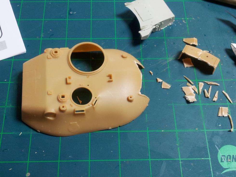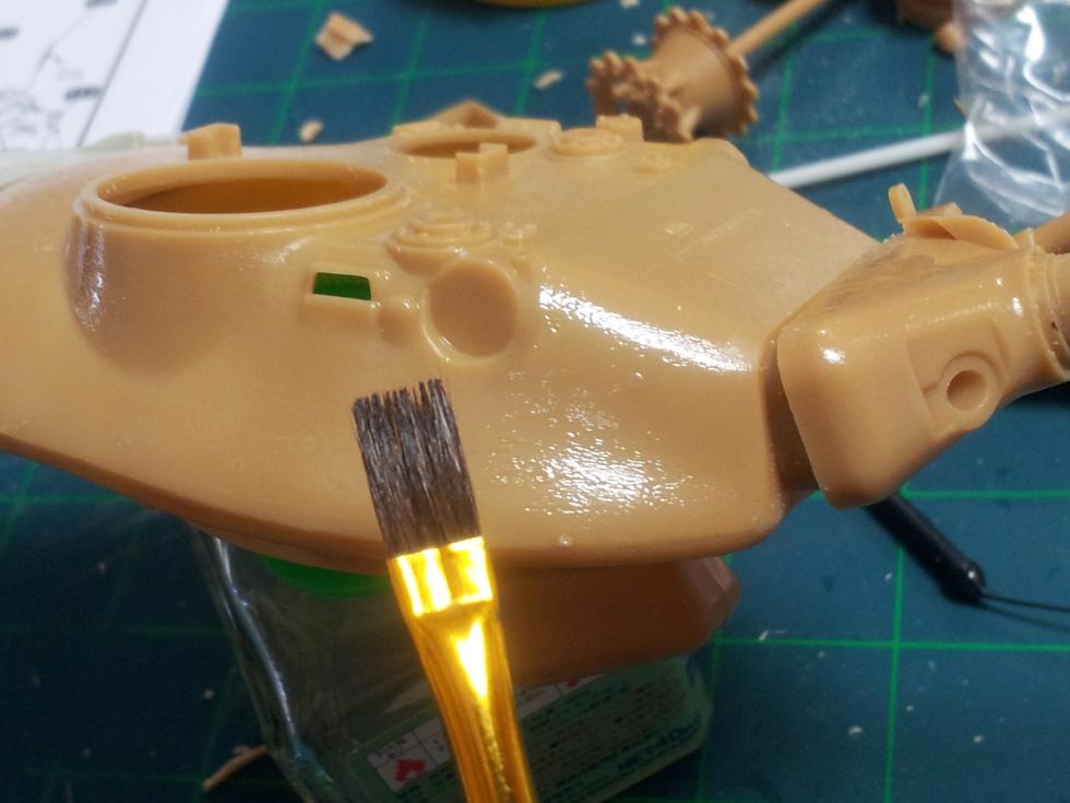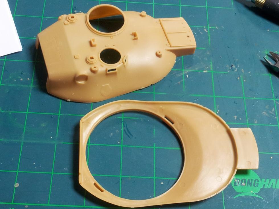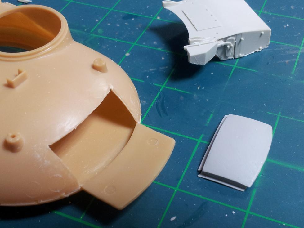하체 접착이 마르는 동안 포탑을 손보는데요 ('0' ) 레진 부품을 붙이기 위해 기존의 후방 공구상자(?)를 잘라내야 합니다..