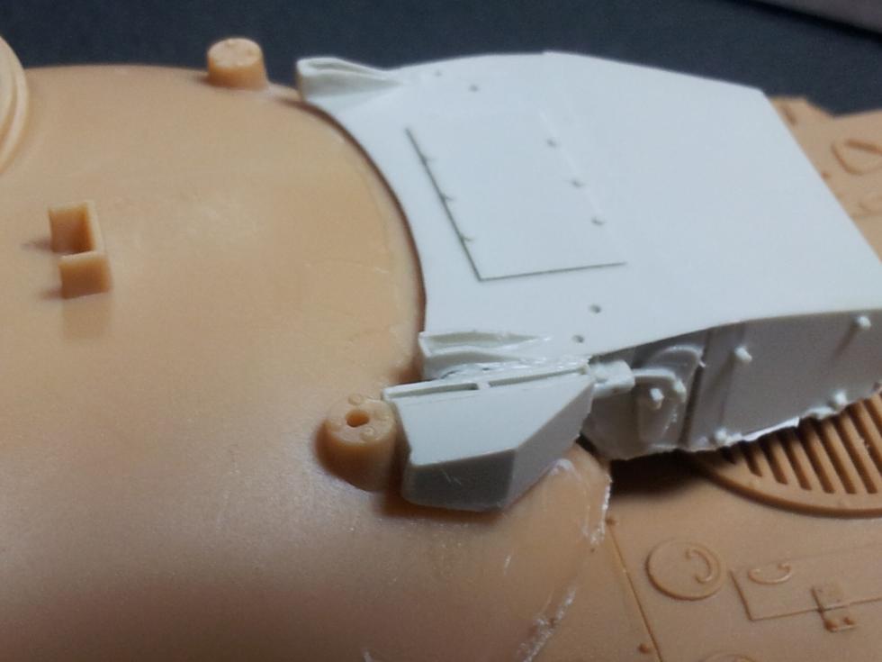그 다음 레진으로 된 격막을 붙여주고, 후방 공구상자(?) 같은 것을 접착해 주면 되는데요, 아쉽게도 이 레진 부품들이 딱 맞지 않습니다.. 많이 갈아내고 깍기도 했으나 결국 완벽한 결합은 안되더군요 ('0' )
