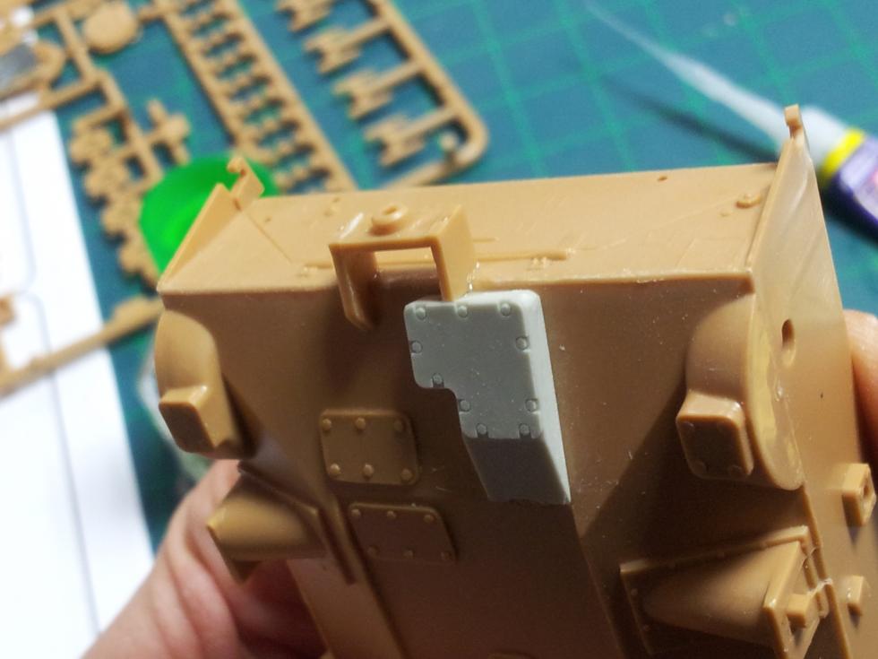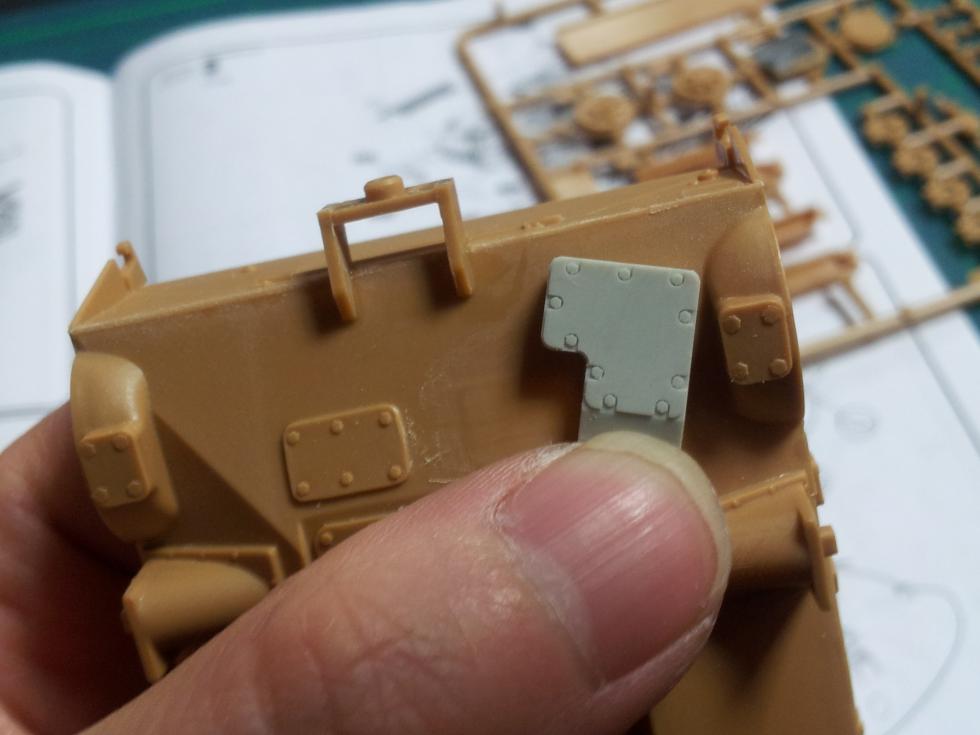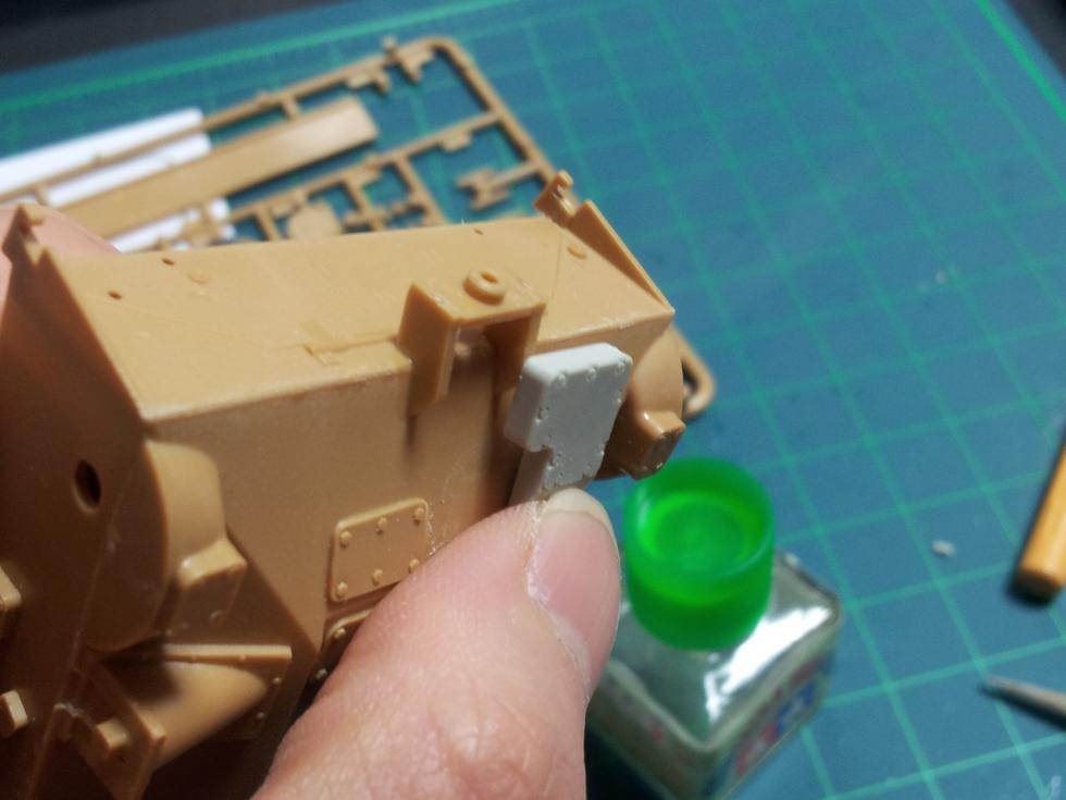 요 포방패 측면에 붙은 센서 같은 큰 레진부품은 포방패에 용접되어 붙는 부착부위가 조금 이상합니다.. 레진으로 된 부착부위의 상면은 조금 잘라서 깍아내고 플라판으로 "L"자 반대 모양을 만들어 측하면 두께 보강을 해주고 포방패에 접착했습니다.. 실사진을 보면 보통 이렇게 부착되더군요 ('0' )