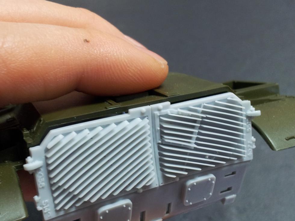 후방 패널 자체는 바로 교체가 가능하도록 되어 있는데, 윗부분의 돌출부가 있으므로 킷트를 좀 깍아내주면 됩니다.. 디테일 자체는 최곱니다.. 레진답게 방열핀도 가늘고 좋네요 ('0' )