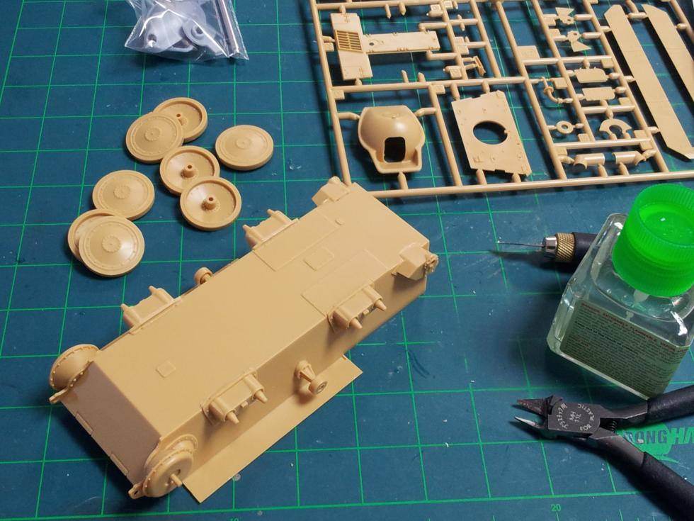 Hetzer를 만들기 위한 가장 저렴한 방법은 아카 Hetzer 후기형을 잡는 것입니다 ^---^ 통닭처럼 누워 있군요~ 조립을 시작하자 마자 벌써 저정도 진도가 나갔습니다~
