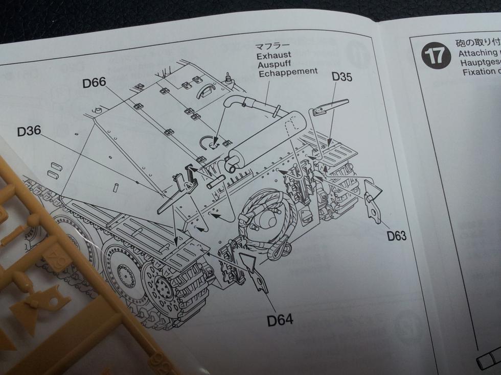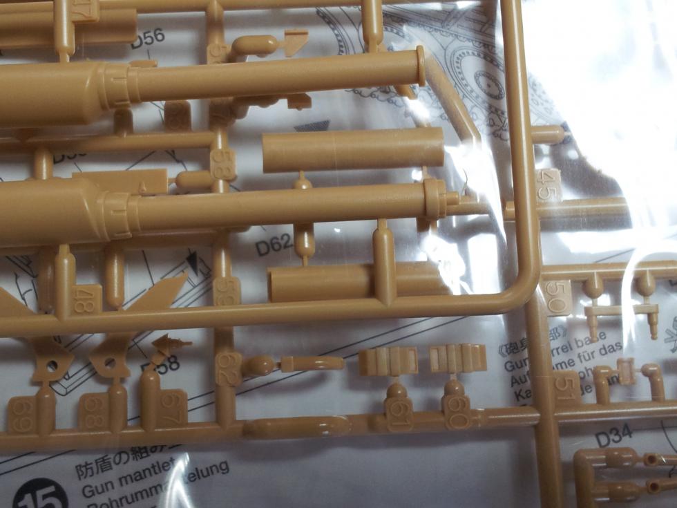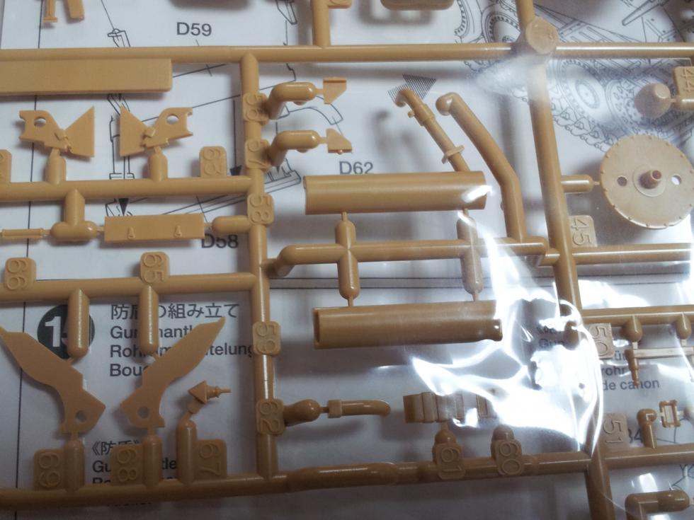 이건 타미야 중기형 Hetzer의 부품입니다..굵은 머플러 소음기 몸체랑 중간 파이프가 연결되고 마지막 배기관(62번)은 ㄱ 자 모양으로 휘어 있죠 ('0' )