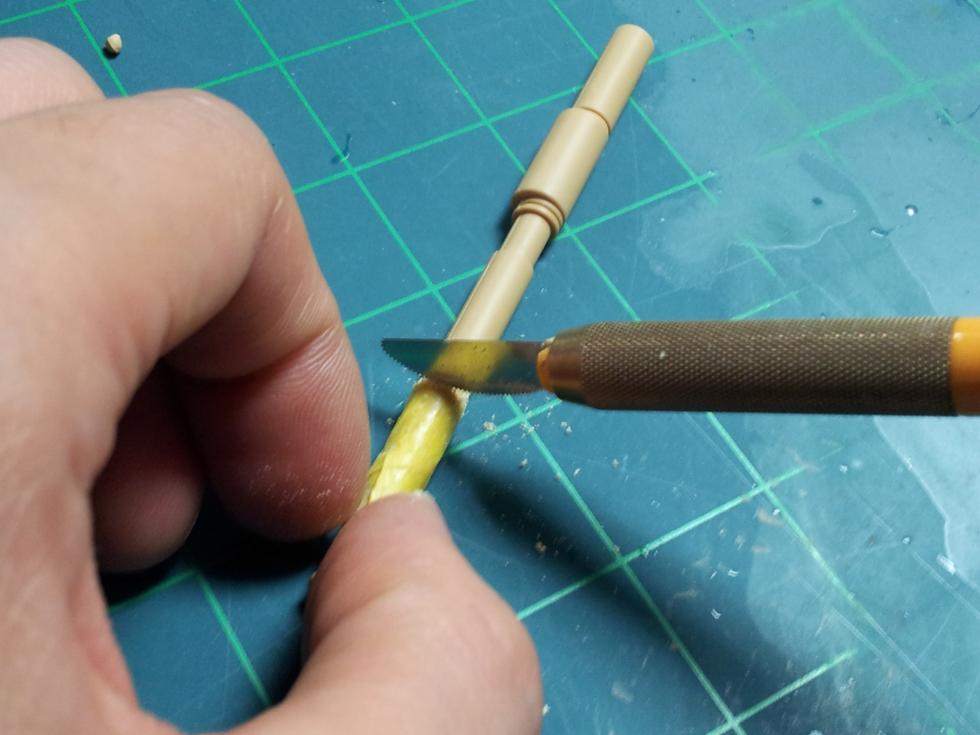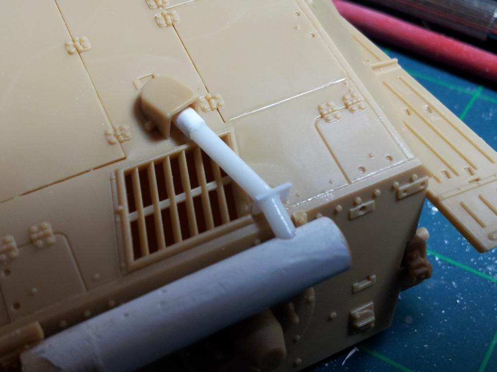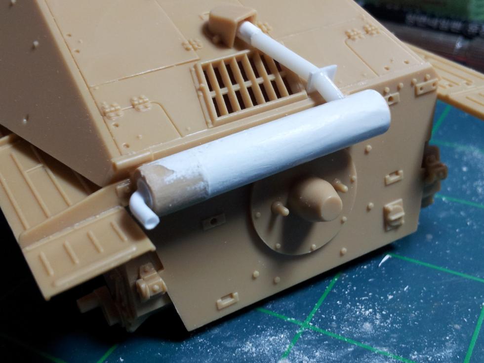 타미야 Hetzer 중기형 머플러는 26mm 입니다.. 그에 맞게 잘랐는데, 나중에 보니 GUP 설정보다 짧더군요.. 실제로는 30~31mm 정도로 길게 잘라야 합니다.. 직경은 6미리 정도 되어야 합니다.. 직경이 부족하면 플라페이퍼를 감거나 마스킹테이프 등을 동원하면 될겁니다 ('0' )