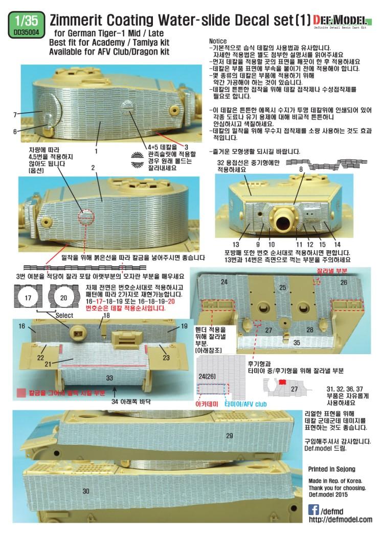 제품에는 위와 같은 설명서가 들어있구요.. 이 제품은 아카데미/타미야 제품을 위해 제작된 것이구요.. 물론 큰 차이가 날리가 없는 AFV클럽제품이나 기존의 찌메리트를 필요로 하는 타이거들에게는 대부분 적용이 가능할 것이라고 생각됩니다.
