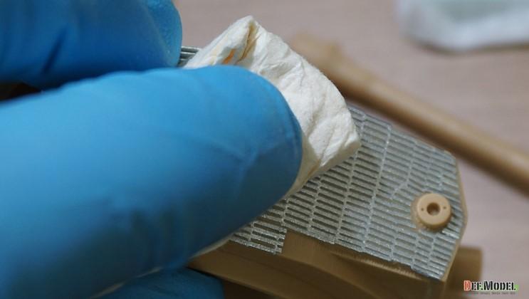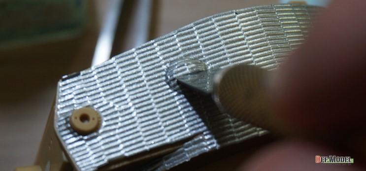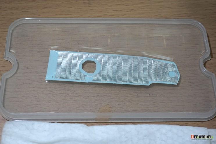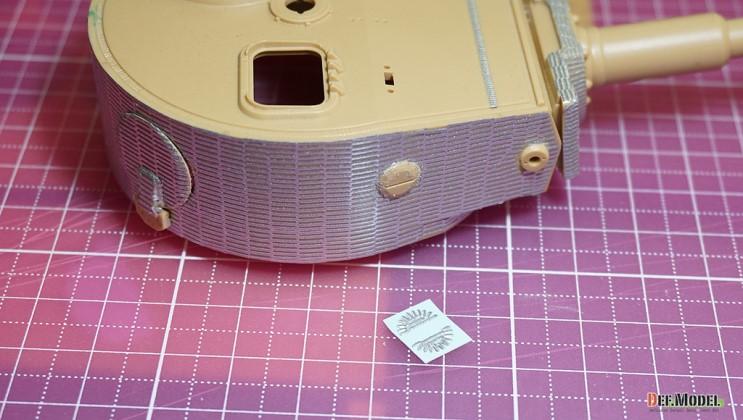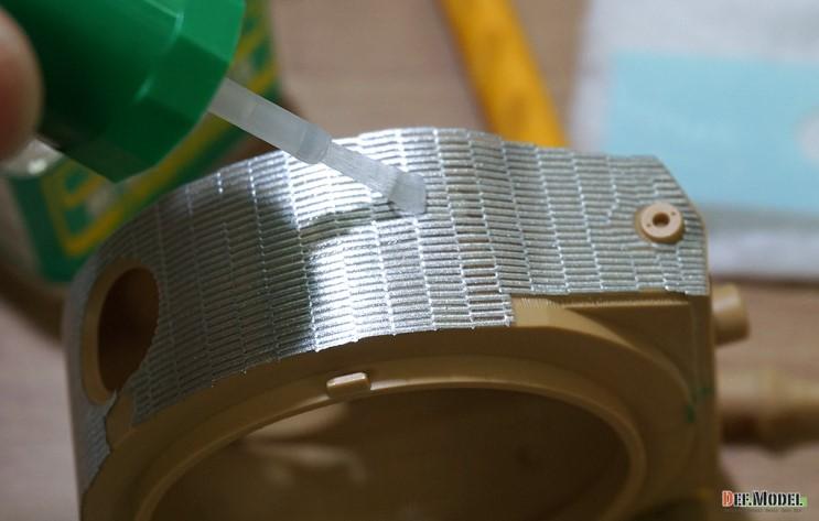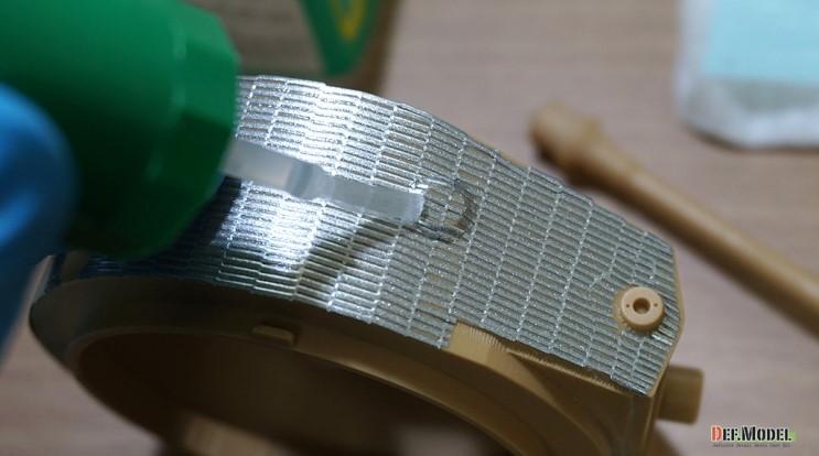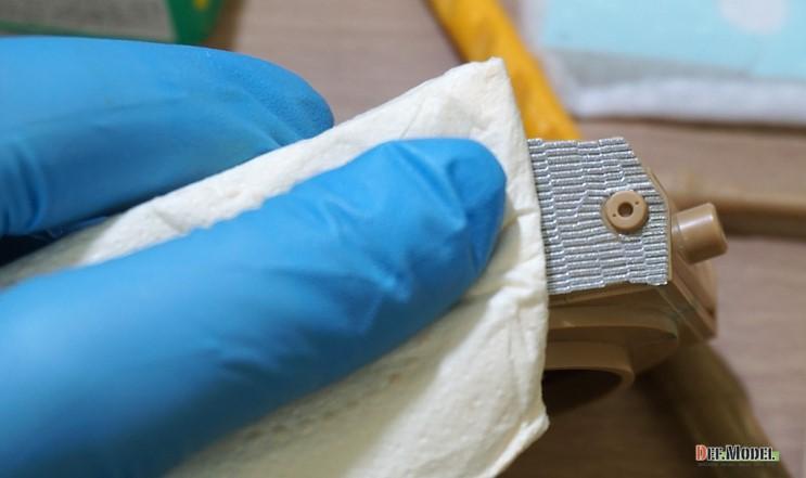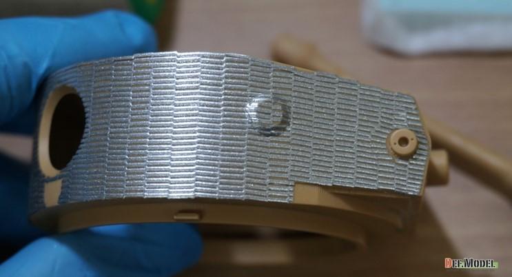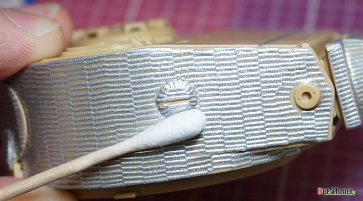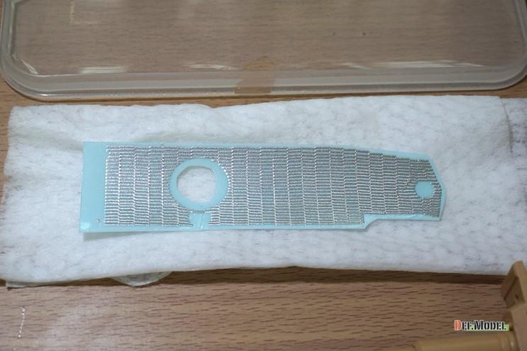 적용 시킬부위중 가장 난이도가 높은 포탑 측면을 예로 작업해 보겠습니다. 대지 뒷면을 물에 살짝 띄워서 대지가 젖도록 2~30초간 둡니다.