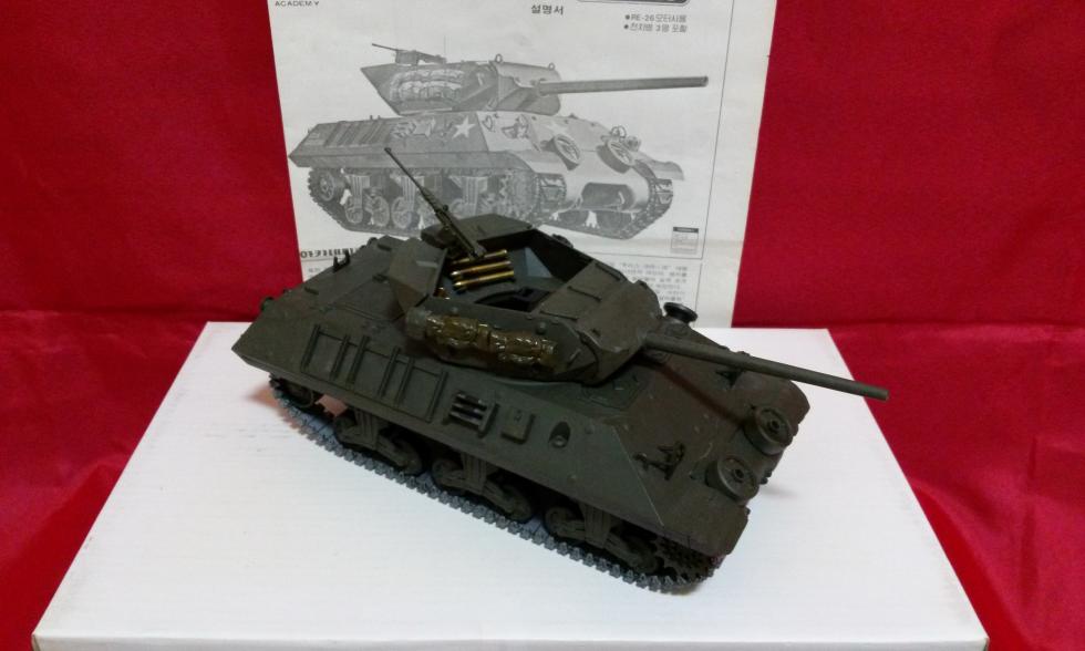 순정 제품에 들어 있는 악세서리를 포탑 측면에 임시로 부착한 모습입니다. 아무래도 M10같은 여러 개의 평면으로 구성된 전차의 경우는 장식품들이 다채롭게 부착이 되어야 본 제품이 더욱 사는 게 아닐까 하는 생각이 드는군요. 별매나 잉여 부품들이 많다면 실사진을 참고하여 충분히 부착하면 좋겠습니다. 포탑 후부에 달려있는 기관총은 순정의 것이 아니며 다른 제품의 것으로 추정됩니다. 하지만 원래의 것이 없어서 적당히 높이를 조정하여 부착을 해 주었습니다. 이는 M10 전차의 무장에 충실을 기하기 위함이며 기관총의 탄창이나 기타 디테일은 차후 업그래이드 해줄 예정입니다.