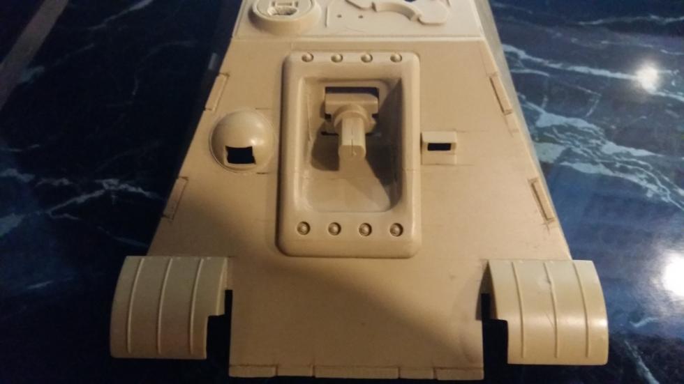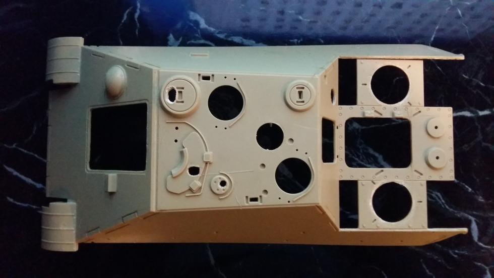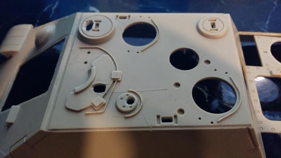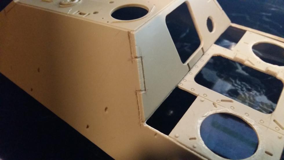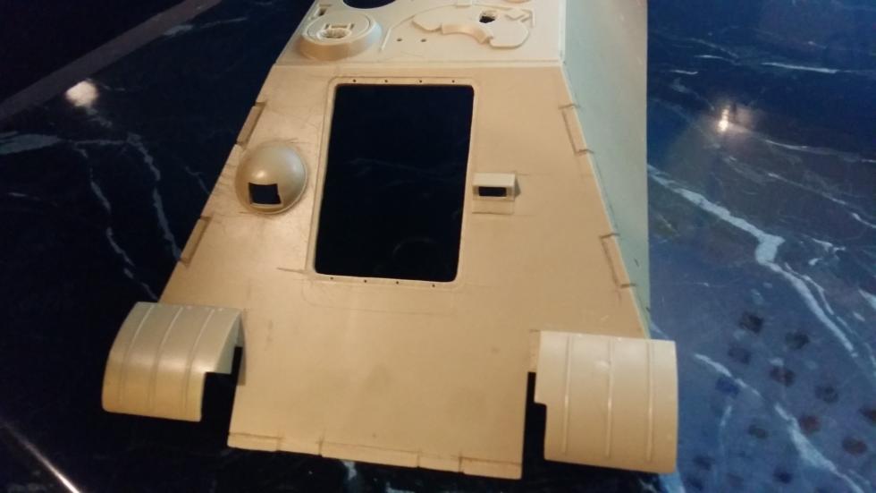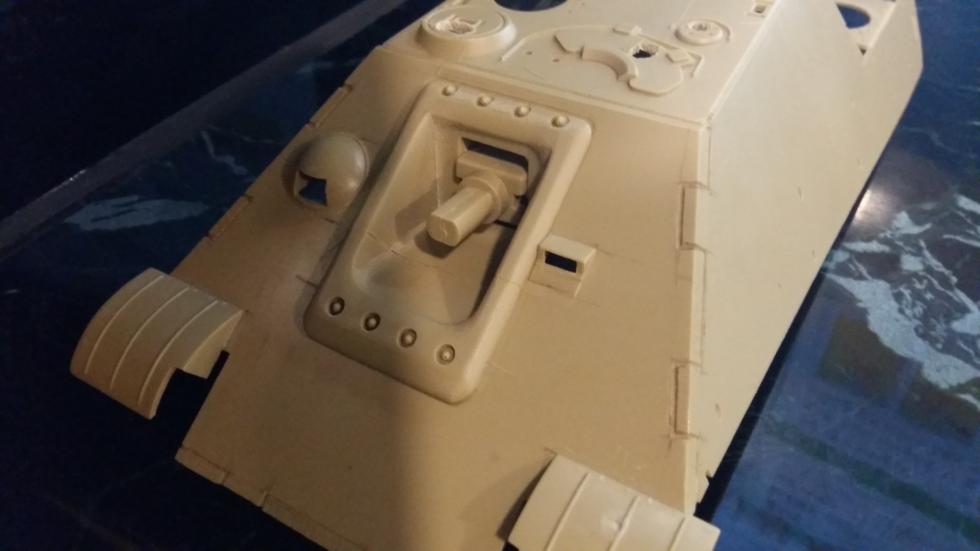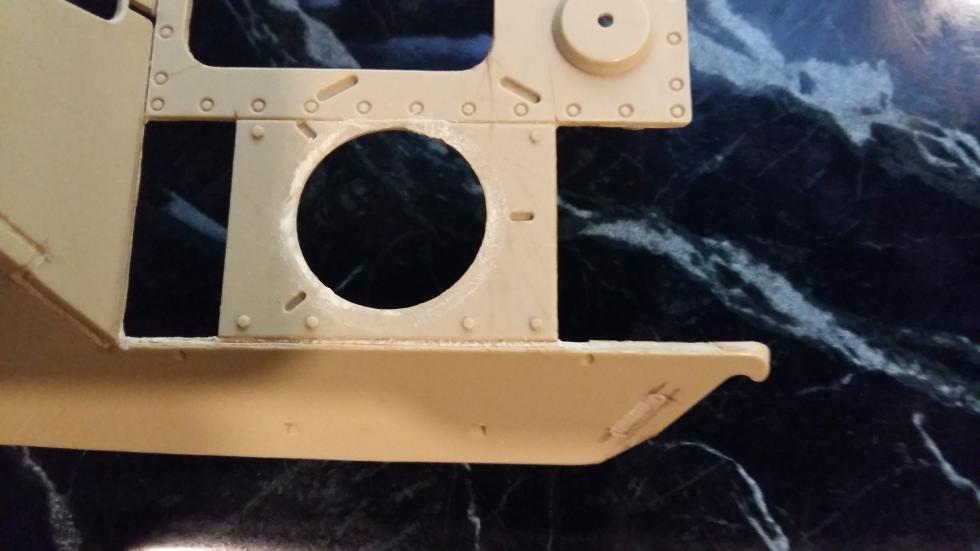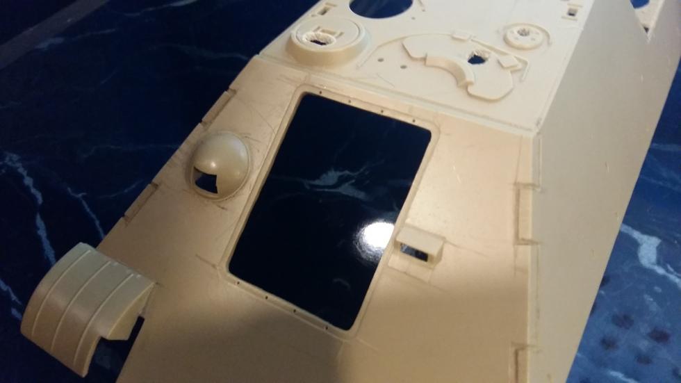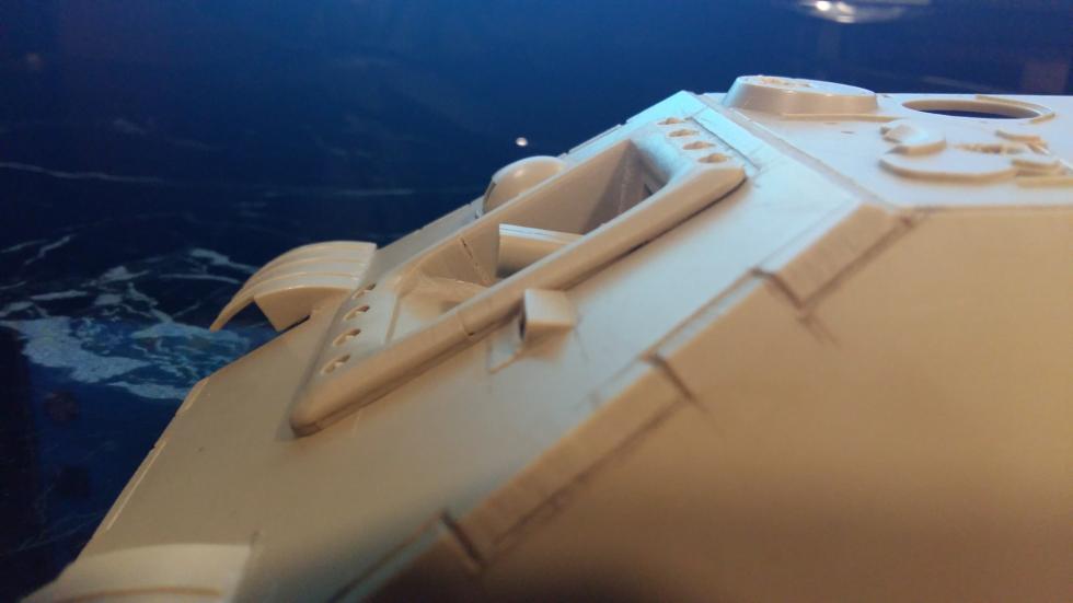후부 또한 같은 작업을 해주었고 사진에는 표시하지 않았지만 실차를 참고로 몇몇 작은 부분의 포인트를 표현해 보았습니다. 후부 해치의 외측면도 경사지게 깍아내고 탄피 배출구도 칼로 작업해 뚫어 주었습니다.