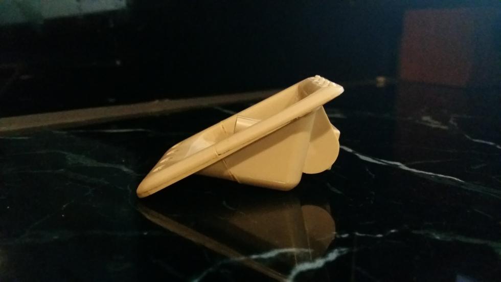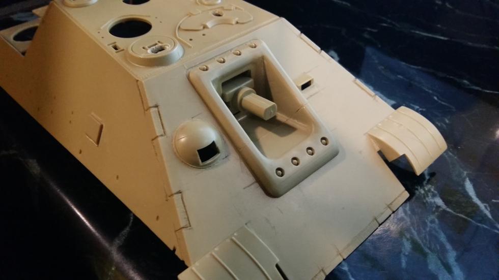 아카데미 야크트판터에서 잘못 설계된 중요한 포인트로 실차에서는 마운트 아래 부분이 위에 비해 두껍고 돌출된 상태인데 반해 키트의 부품에서는 위아래 차이가 없기 때문에 불필요 부품을 잘라 덧대준 상태 입니다.