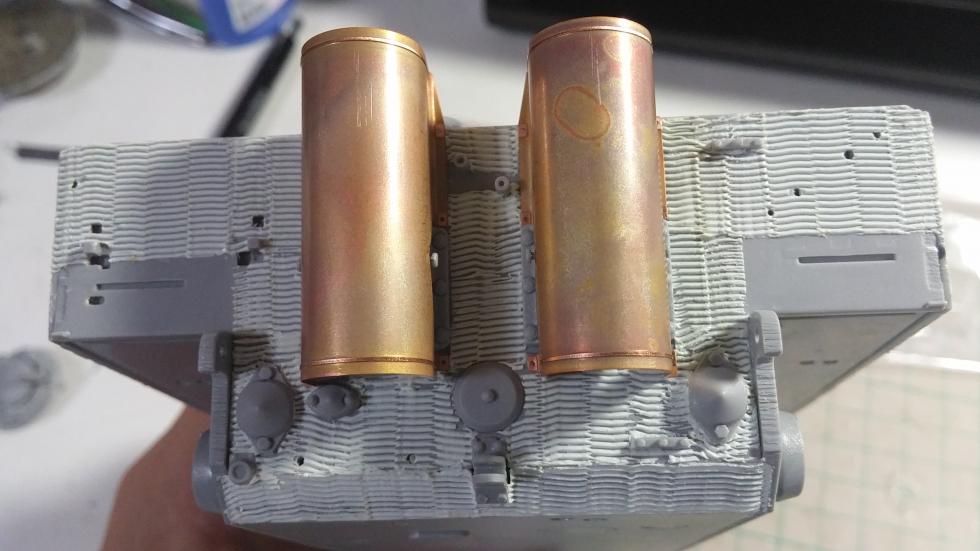 배기구는 킷의 부품을 그대로 쓰되 사진처럼 레진제 볼트와 에칭으로 디테일업을 했습니다.