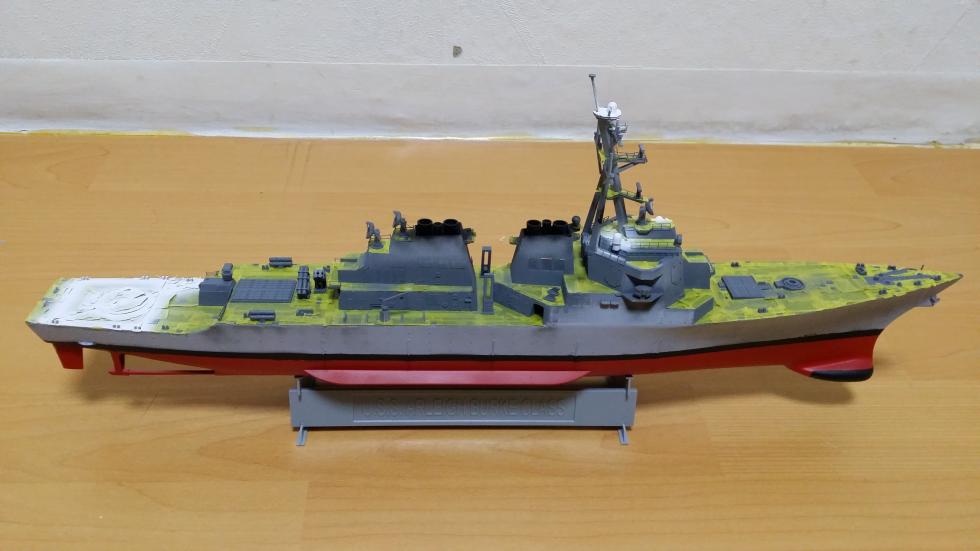 갑판 도색과 갑판 마스킹 완료하고 헬기 유도표시, 안테나등 흰색이 필요한 부분도색하고, Hull 부분 도색했습니다.