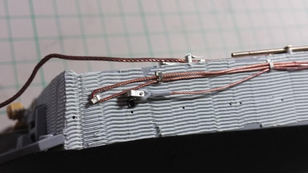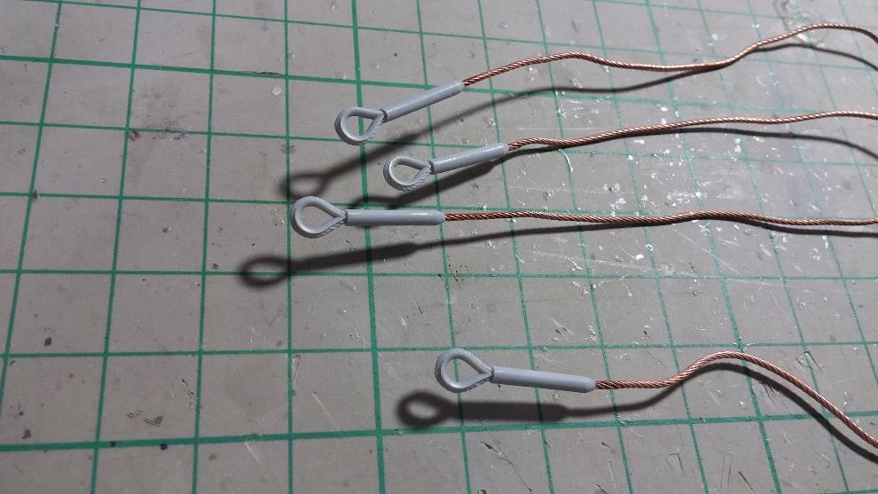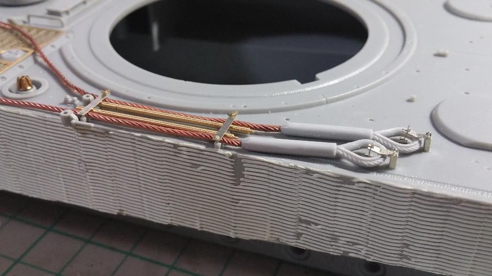 왼쪽 견인케이블은 이렇게 붙혔습니다. 붕뜬 건 좀 더 작업 후에 조정합니다.