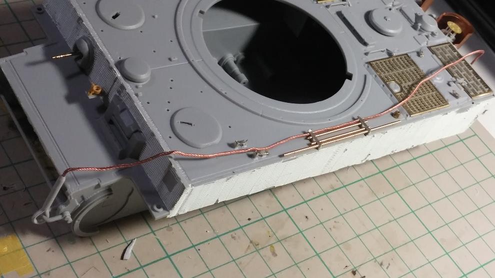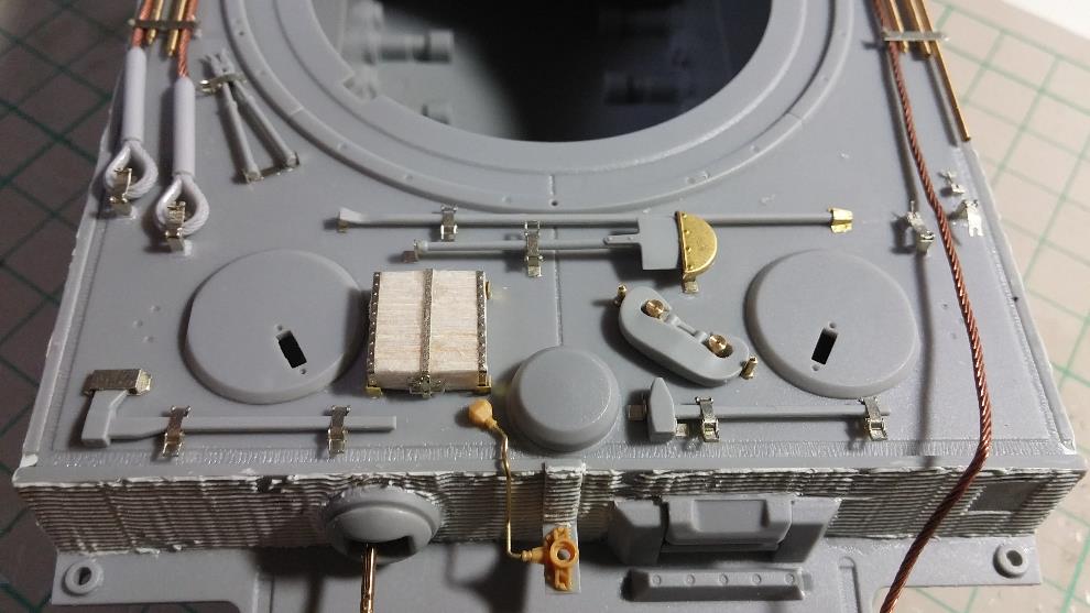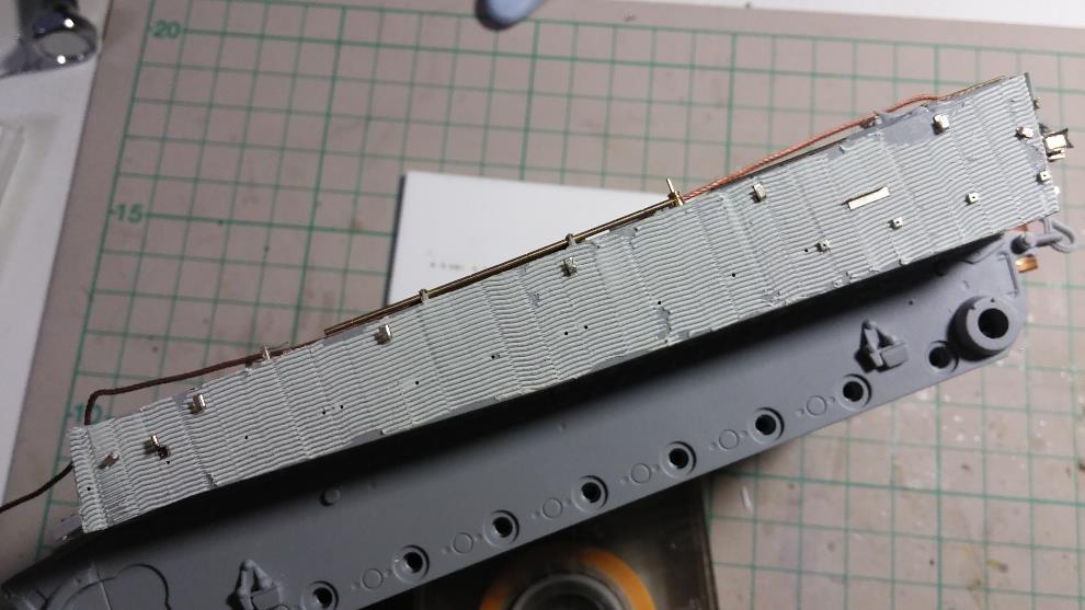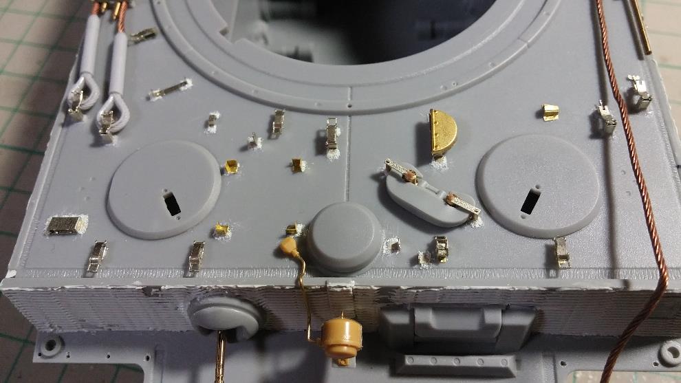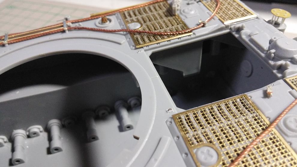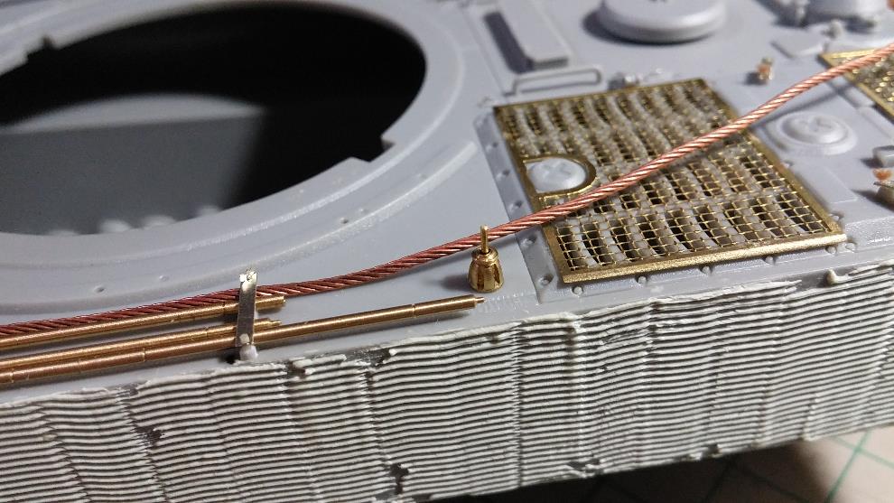 차체 오른쪽에 궤도 교체용 케이블 부착을 위해 위치를 잡아서 찌메리트 코팅을 벗기고 에칭을 붙혔습니다.
