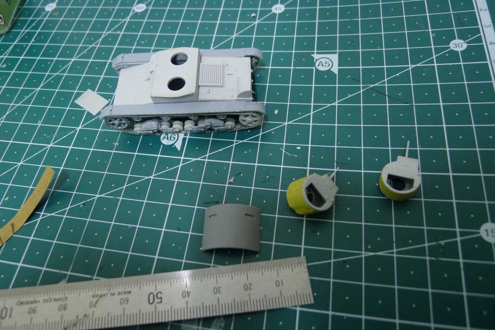 유일한 제작 중 사진, 마스킹 테이프로 생략된 소총탑 측면에 리벳을 심어줬는데 사진자료가 애매해서 35킷을 구매하여 참고했습니다.